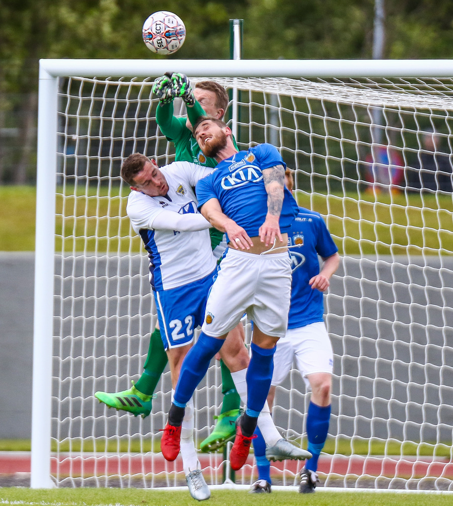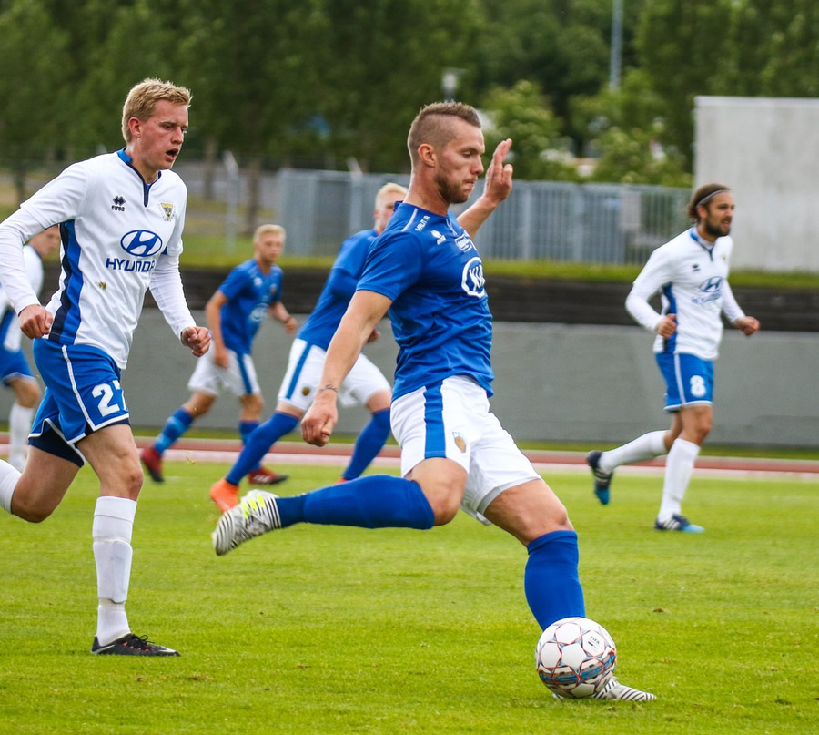 RÉTT FRAMHJÁ! Ingólfur Sigurðsson með aukaspyrnu á stórhættulegum stað. Rétt framhjá! Fór af varnarmanni.