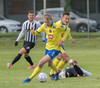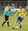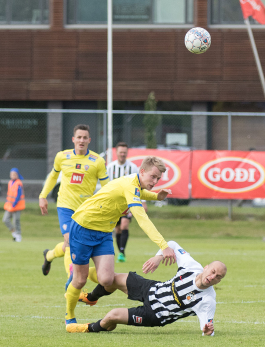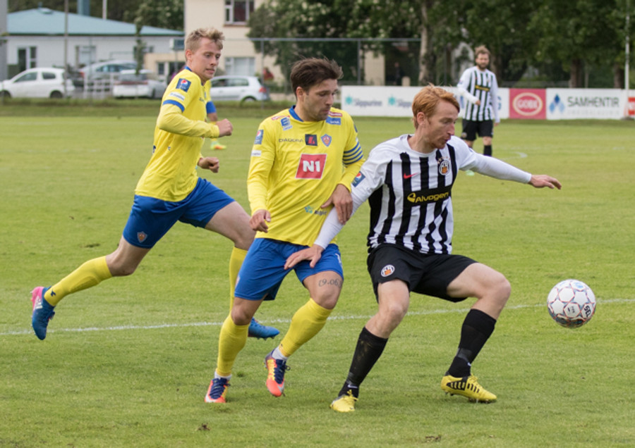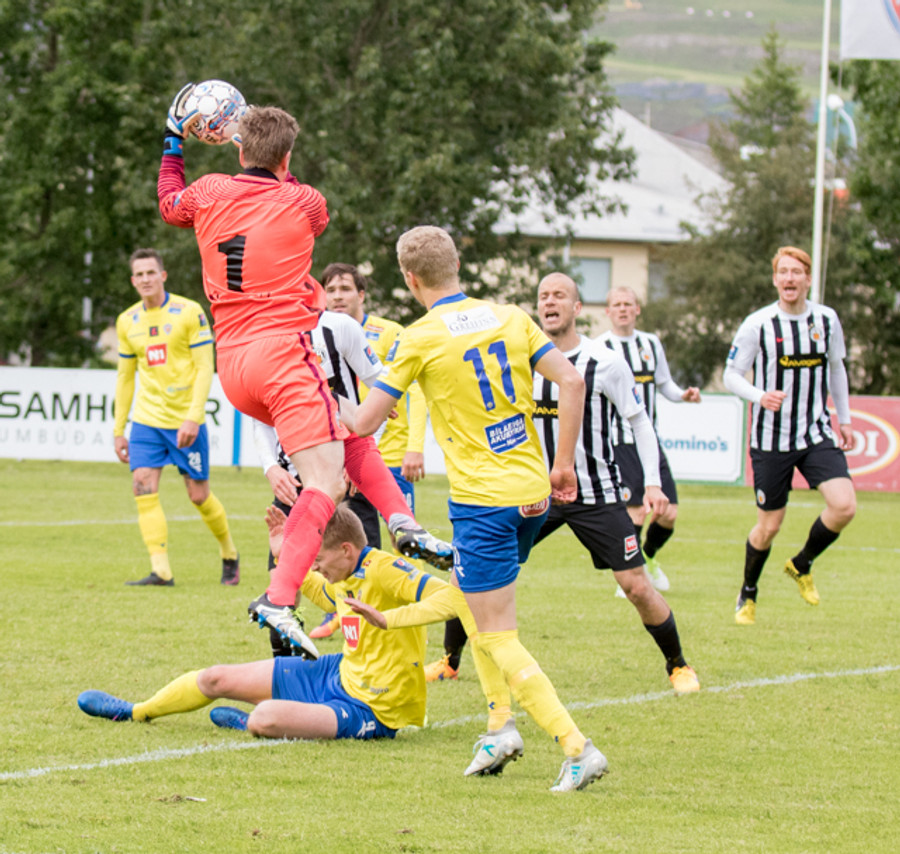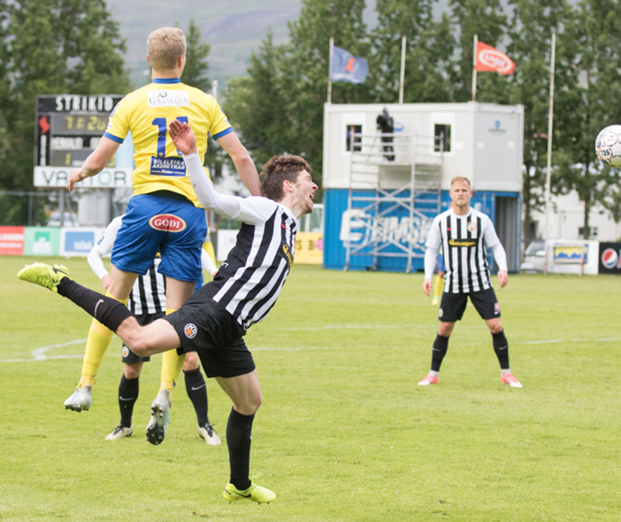 Skúli Jón alltof seinn í Elfar út á miðjum vellinum og fær réttilega gult spjald.