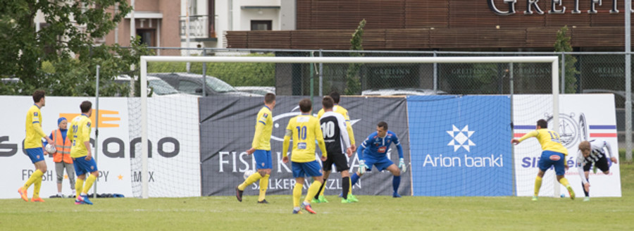 KR-ingar eru komnir yfir strax á annari mínútu! Arnór Sveinn setur hann yfir á Tobias sem skallar hann í varnarmann og inn af stuttu færi.