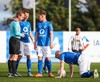 Haraldur Björnsson liggur eftir á vellinum og þarfnast aðhlynningu. Það yrði ekki gott fyrir Stjörnuna ef hann myndi meiðast, en hann var að koma aftur inn í liðið fyrir síðasta leik eftir meiðsli. En hann er kominn á fætur og heldur áfram.