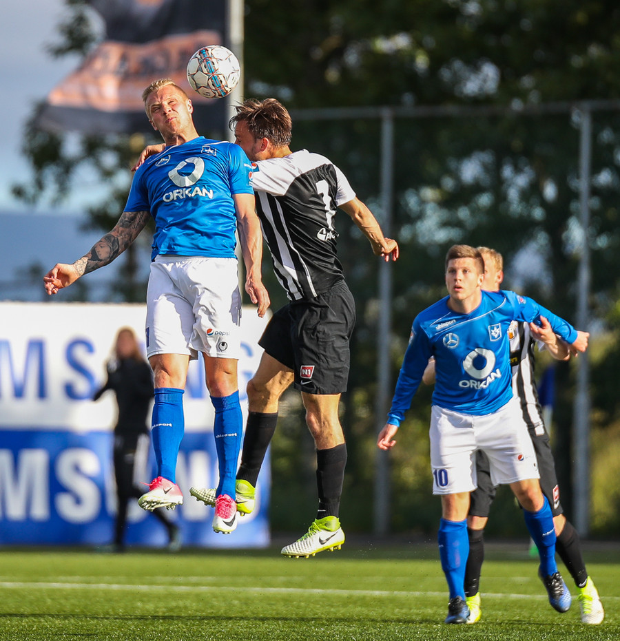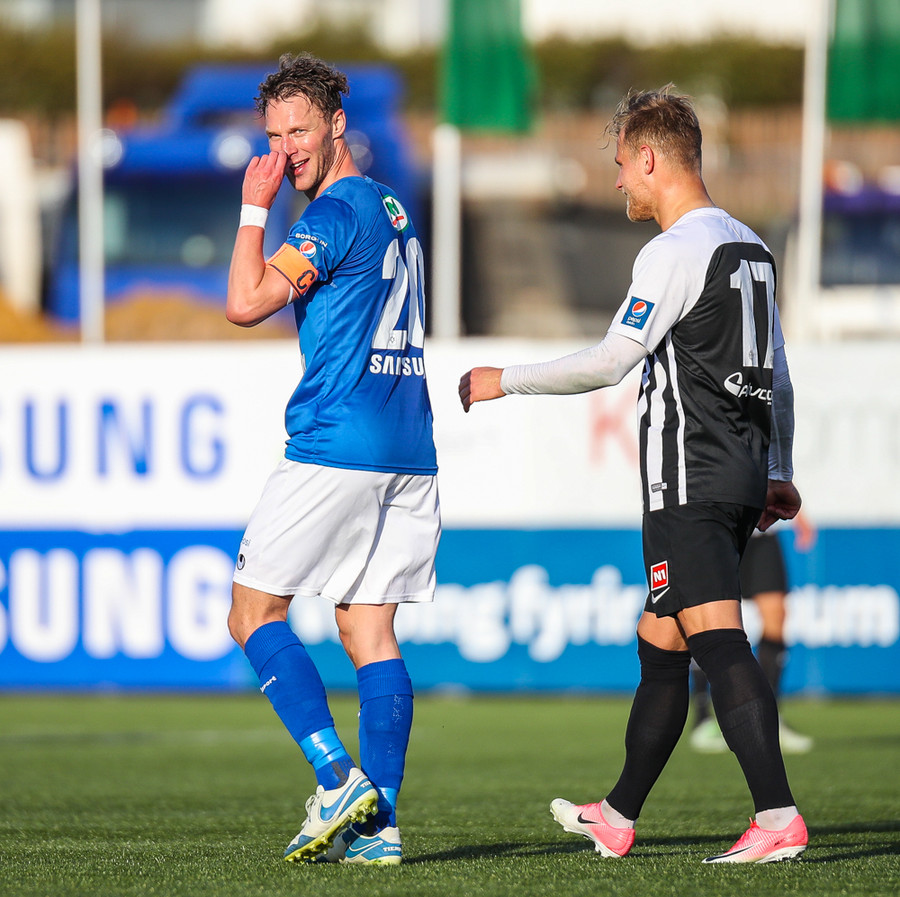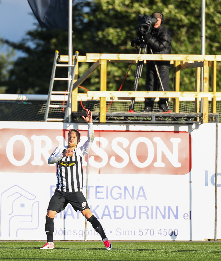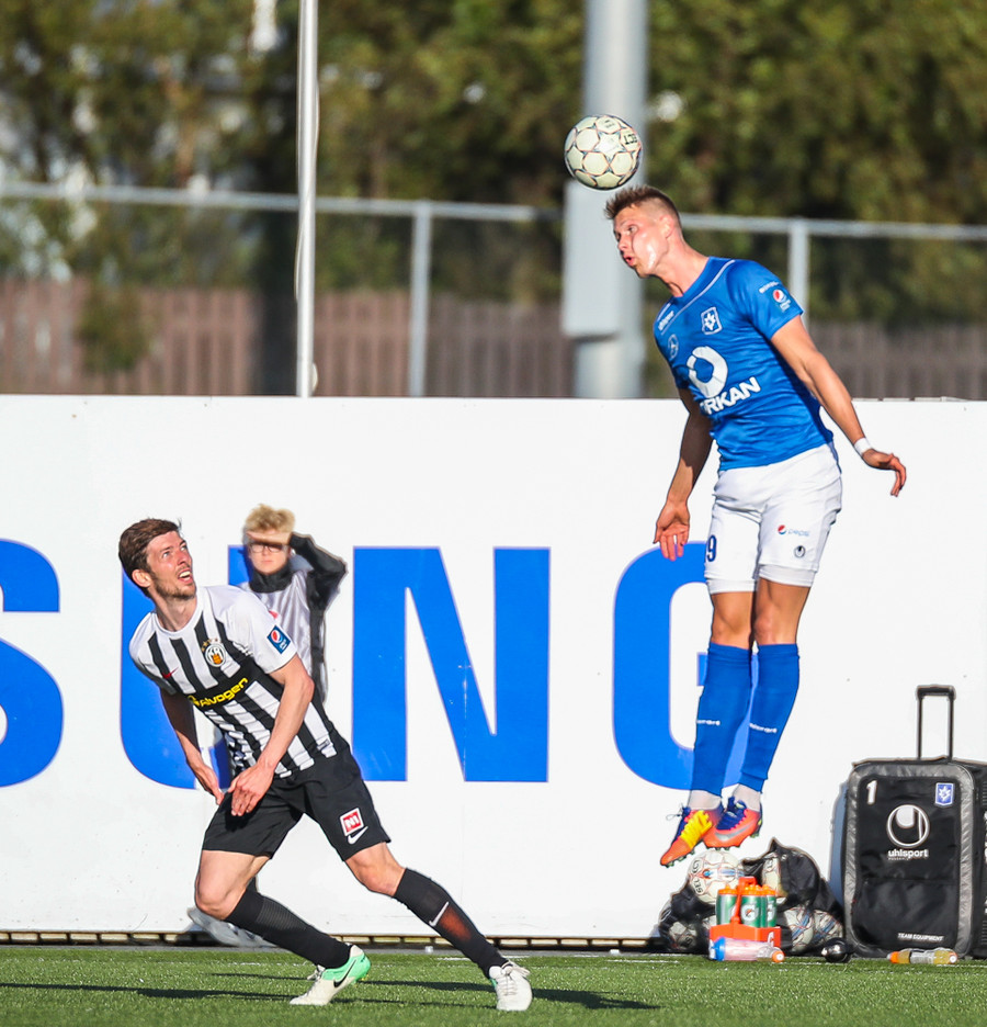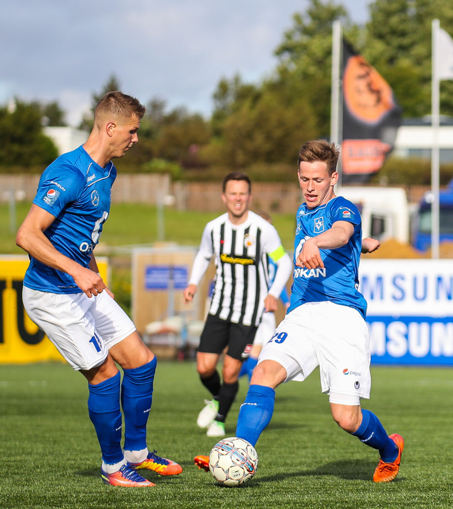 MAAAARKKKKK! Tobias Thomsen skallaði boltanum í markið eftir að Kenny hafði flikkað honum til hans eftir að skalla hann eftir hornspyrnu frá Óskari Erni. Við erum komin með leik!