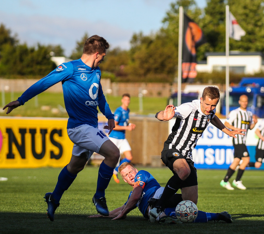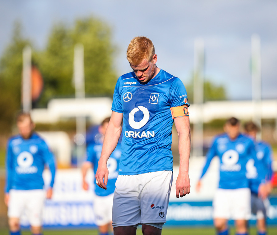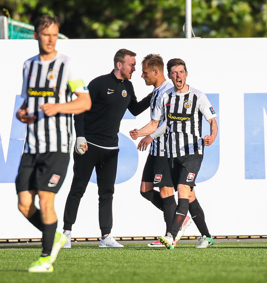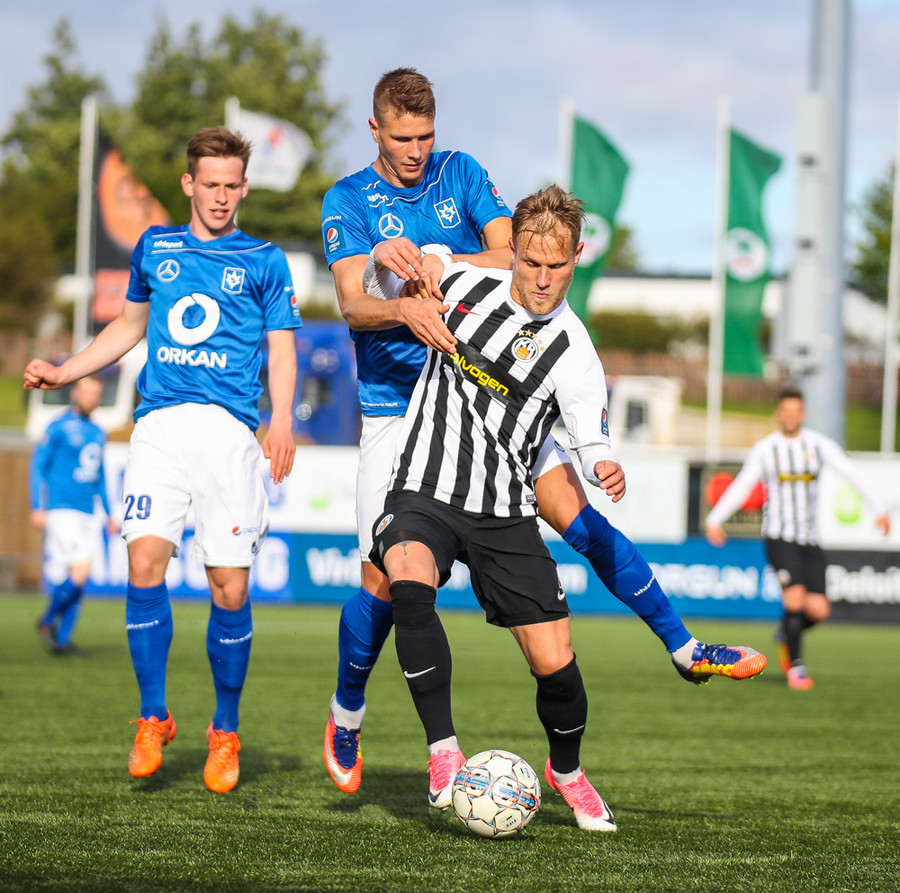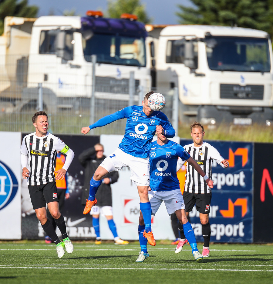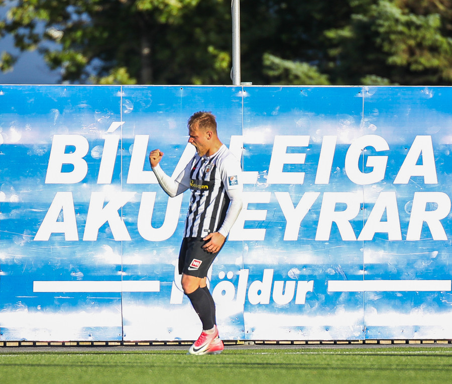 MAAAARKKKKK! Tobias Thomsen skallaði boltanum í markið eftir að Kenny hafði flikkað honum til hans eftir að skalla hann eftir hornspyrnu frá Óskari Erni. Við erum komin með leik!