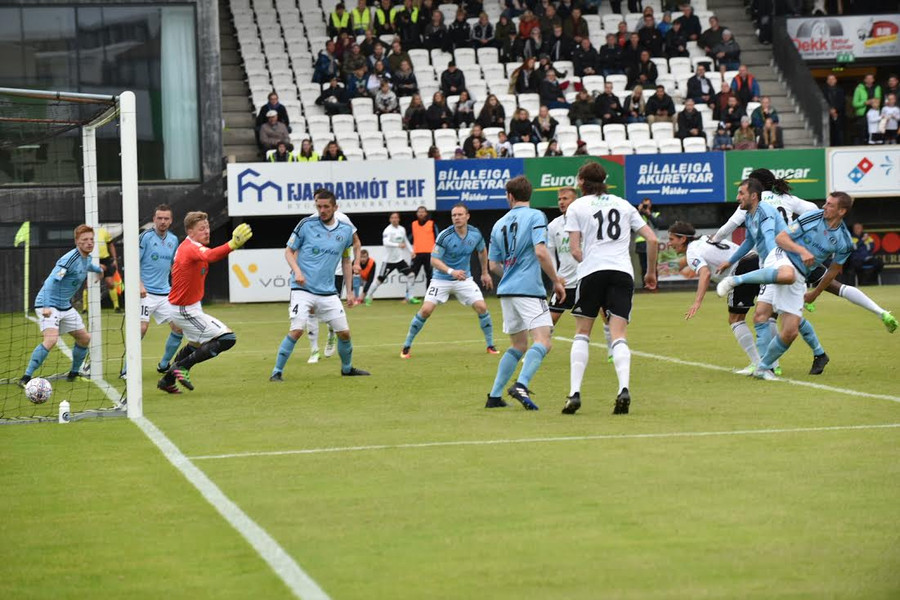 Böðvar með aukaspyrnu á fjærstöngina, Kassim í baráttunni og gestirnir skalla í horn. Það liggur vel á gestunum þessa stundina.