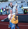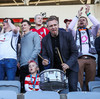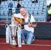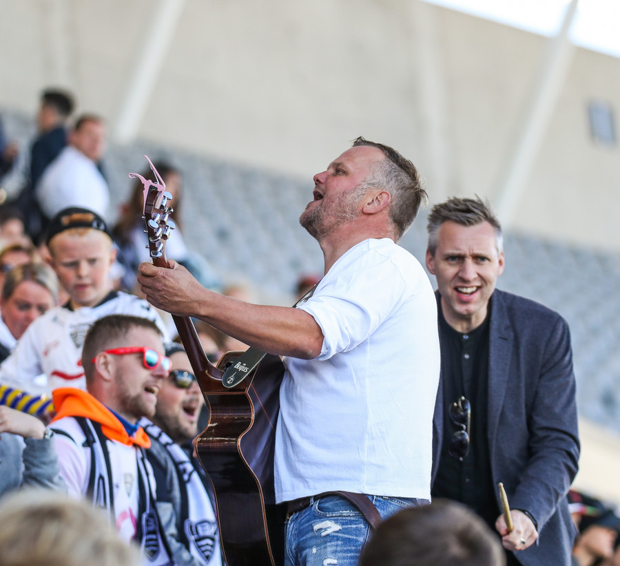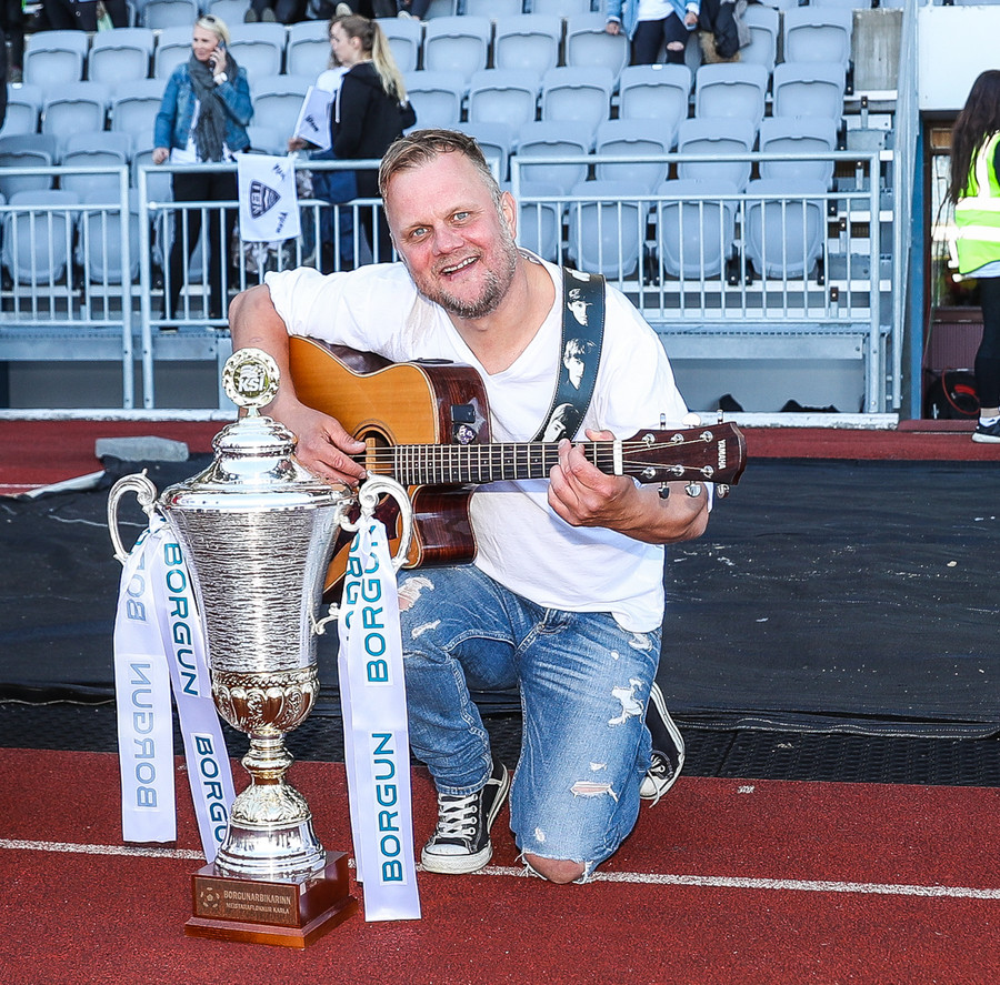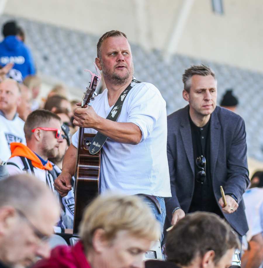 Man ekki til þess að hafa séð gítarleikara í stúkunni á fótboltaleik en það kemur ekkert á óvart að eyjamenn brjóti þann ís, snillingar.