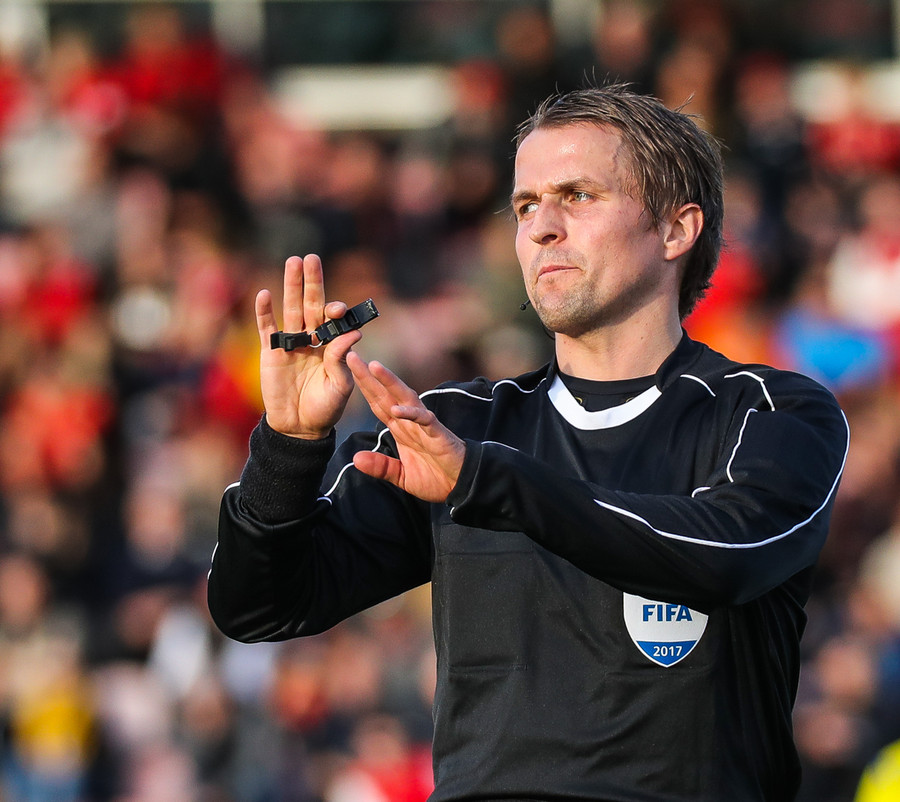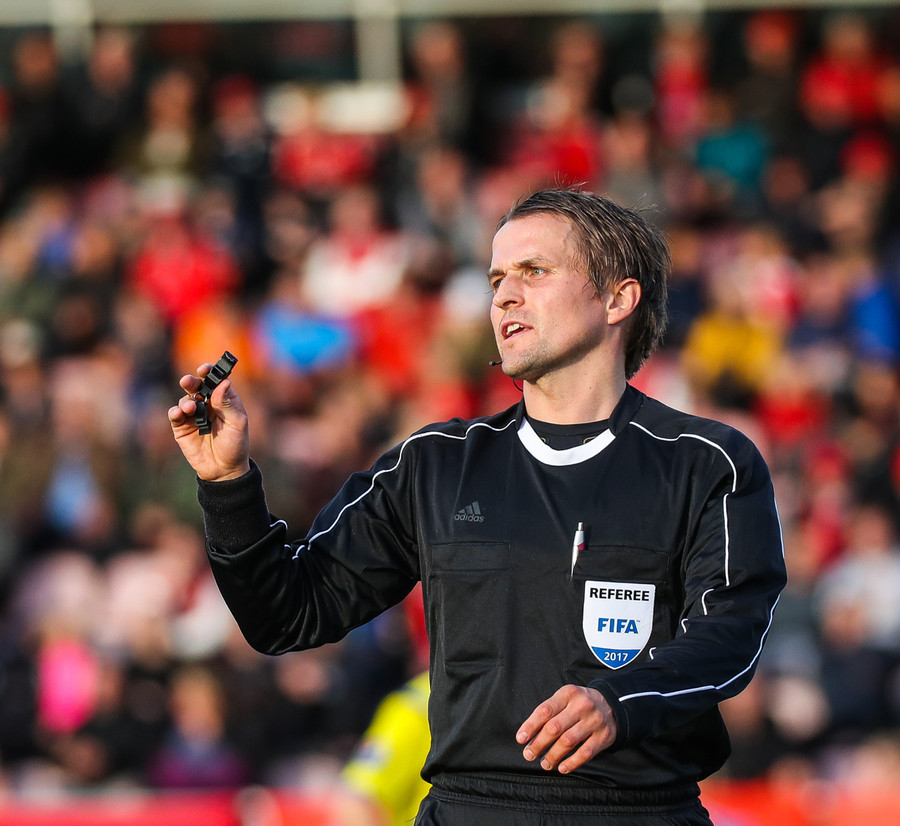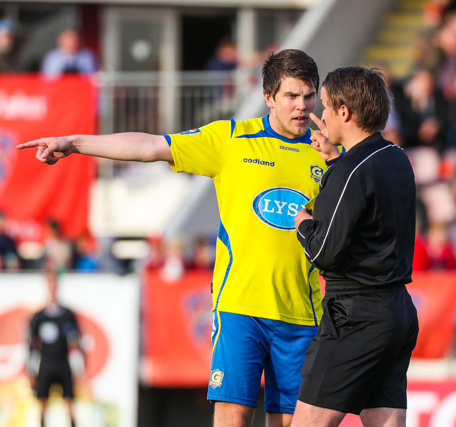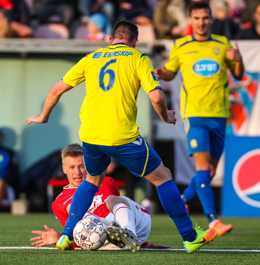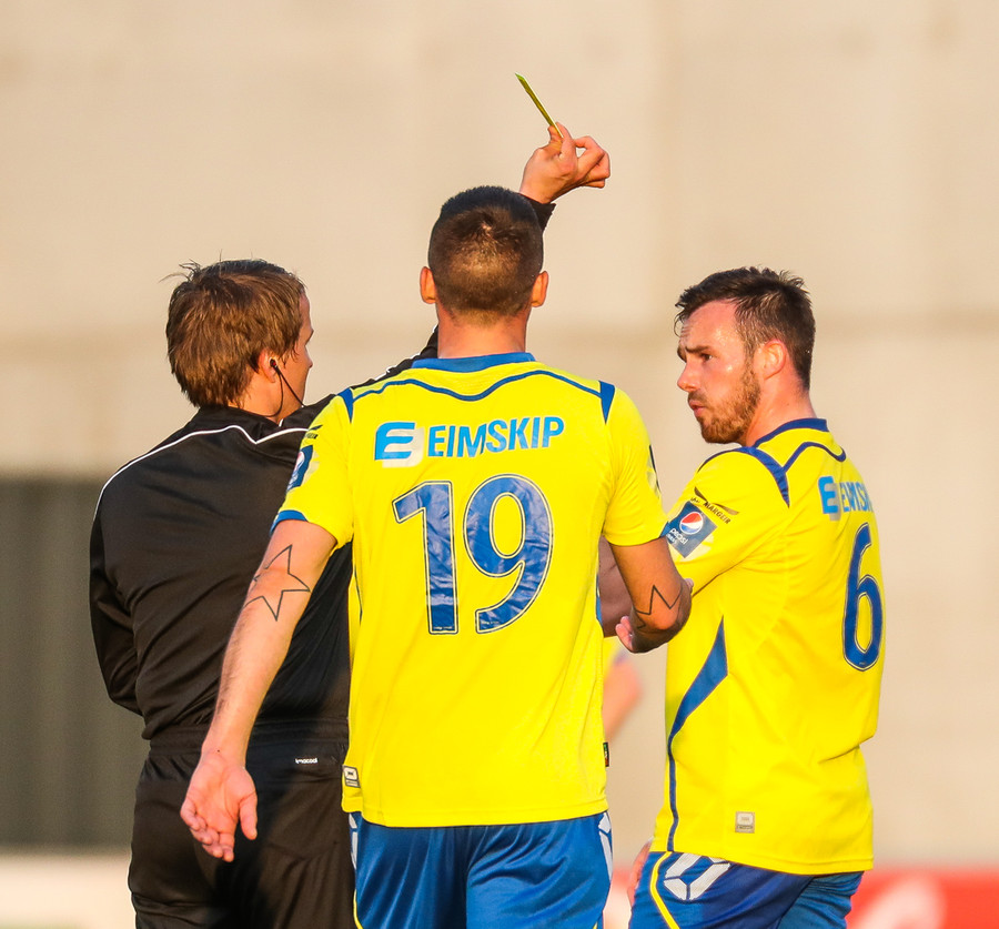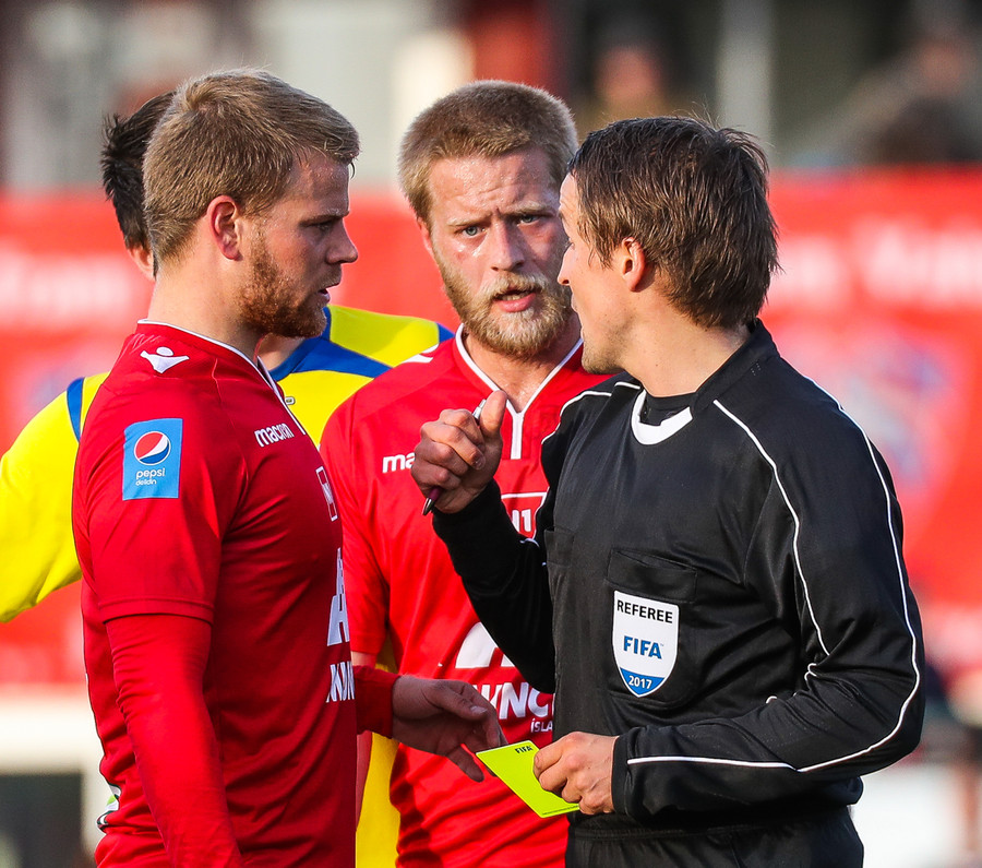 Brynjar Ásgeir, oft kallaður hinn íslenski John O'Shea, fer aftan í Patrick Pedersen. Skömmu áður hafði Haukur Páll brotið harkalega af sér en Jarlinn beitti hagnaðarreglunni þá. Núna dæmdi hann aukaspyrnu á Brynjar og veifaði spjaldi á hann og Hauk Pál.