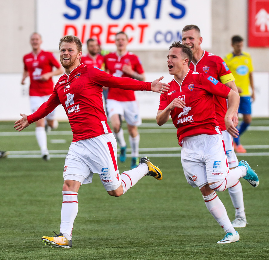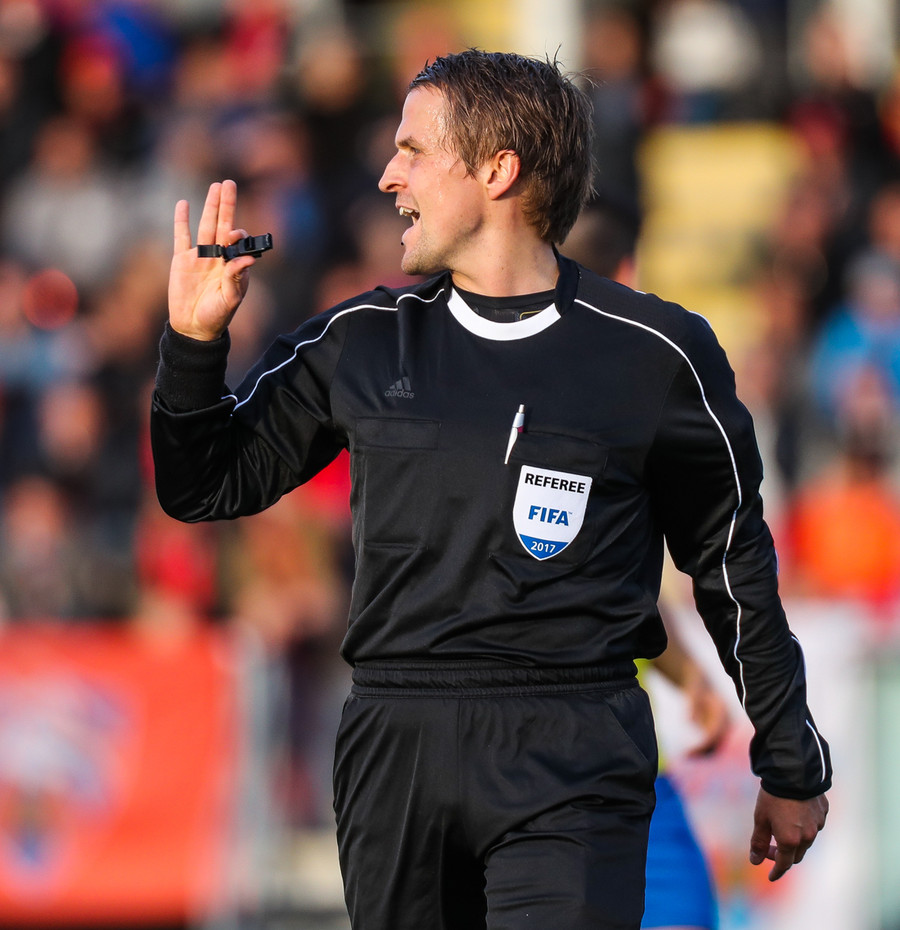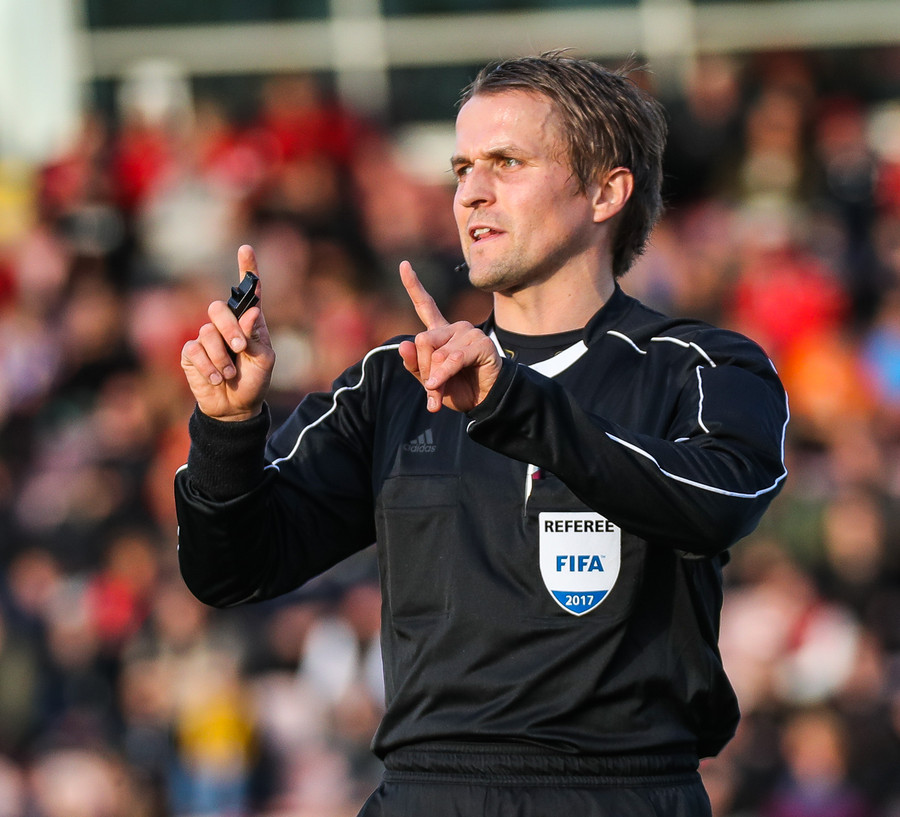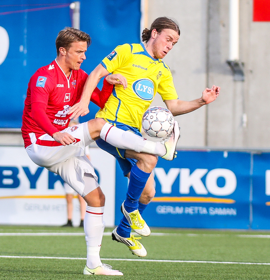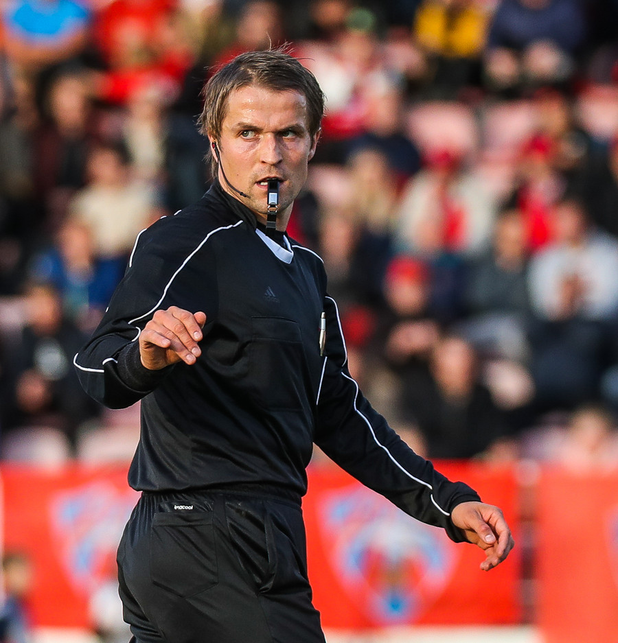 Brynjar Ásgeir, oft kallaður hinn íslenski John O'Shea, fer aftan í Patrick Pedersen. Skömmu áður hafði Haukur Páll brotið harkalega af sér en Jarlinn beitti hagnaðarreglunni þá. Núna dæmdi hann aukaspyrnu á Brynjar og veifaði spjaldi á hann og Hauk Pál.