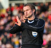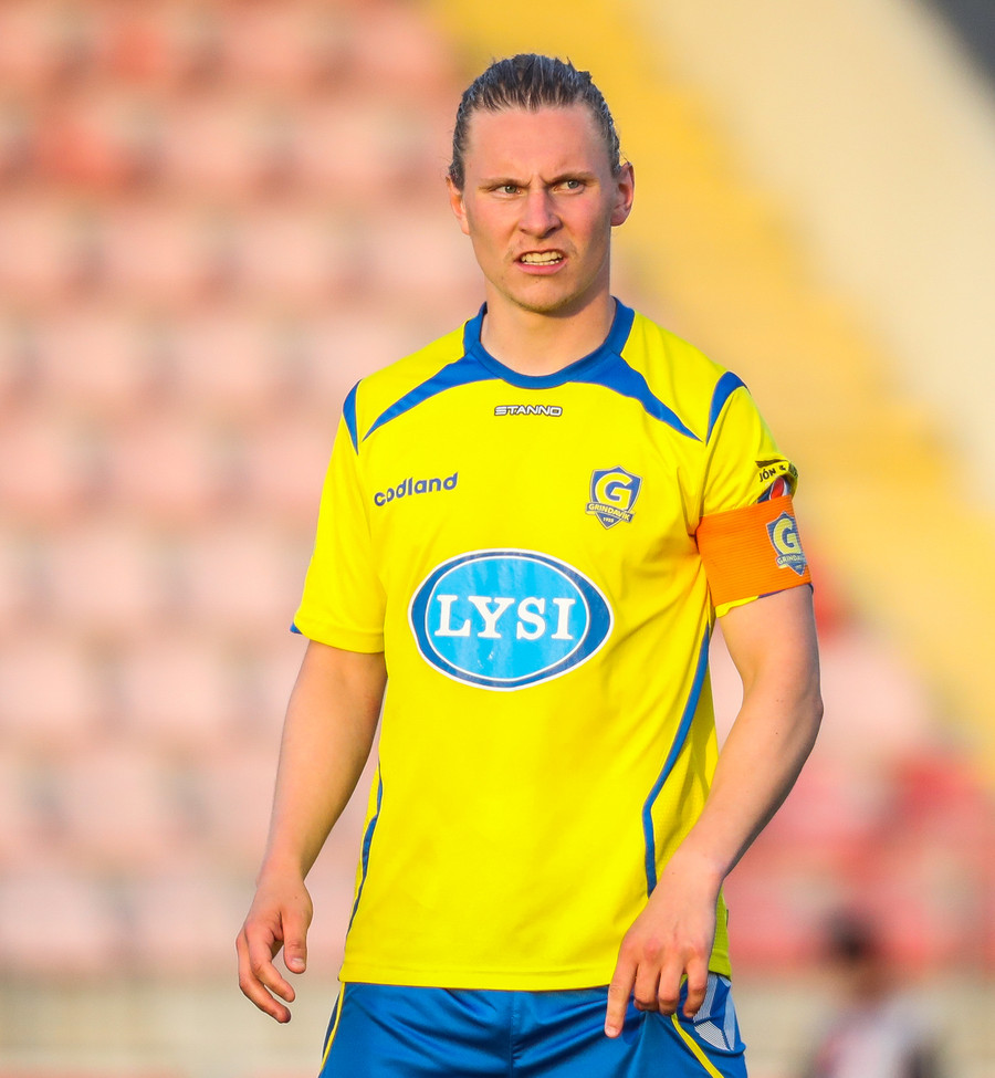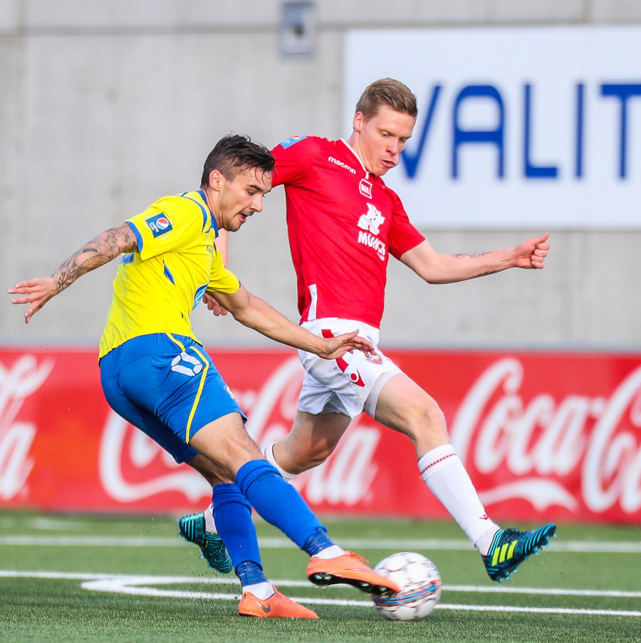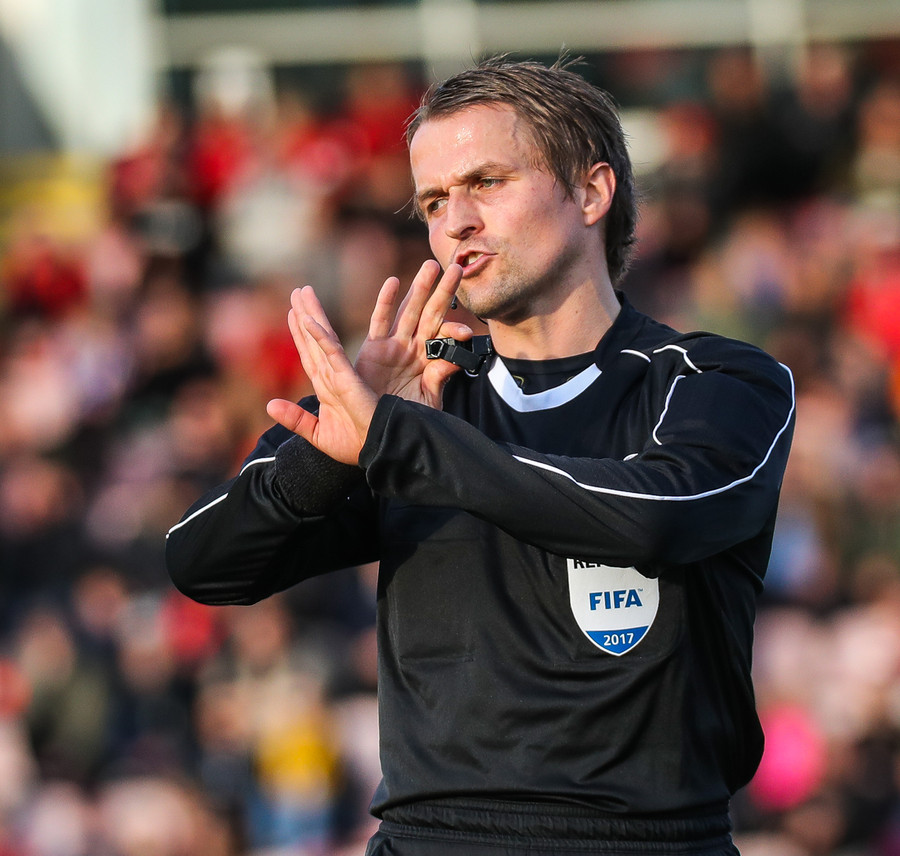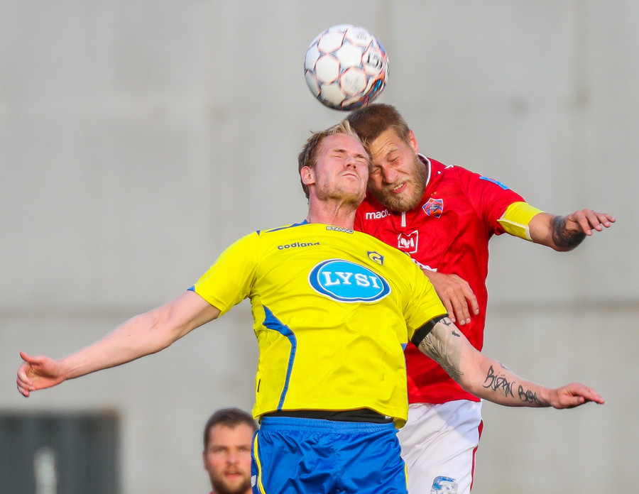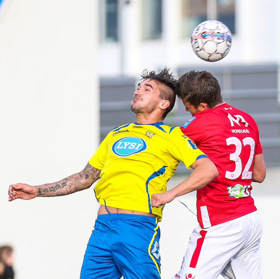 Brynjar Ásgeir, oft kallaður hinn íslenski John O'Shea, fer aftan í Patrick Pedersen. Skömmu áður hafði Haukur Páll brotið harkalega af sér en Jarlinn beitti hagnaðarreglunni þá. Núna dæmdi hann aukaspyrnu á Brynjar og veifaði spjaldi á hann og Hauk Pál.