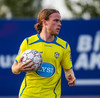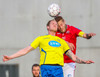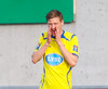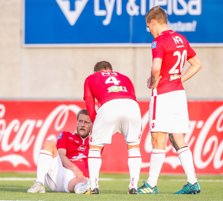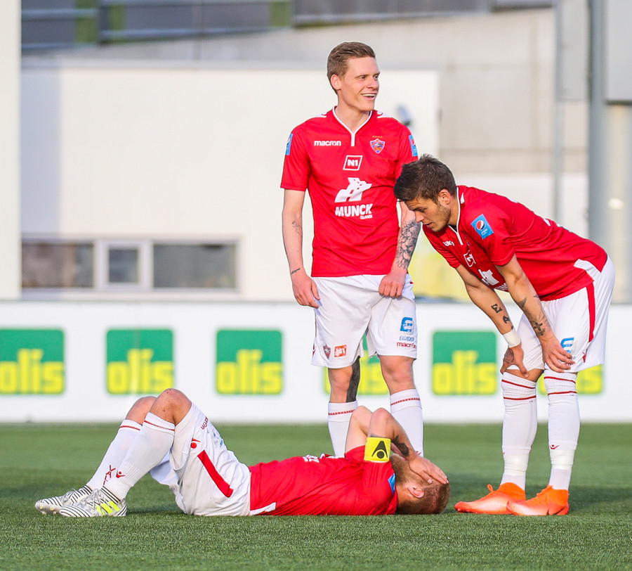 Haukur Páll lemur í grasið í reiði sinni. Leik hans er lokið í dag.