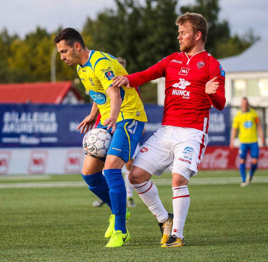 Kristinn Ingi vinnur boltann af Gunnari á hægri kantinum! Kristinn tekur mikinn sprett en Jajalo er á tánum og nær að tækla boltann út við hliðarlínu. Innkast.
