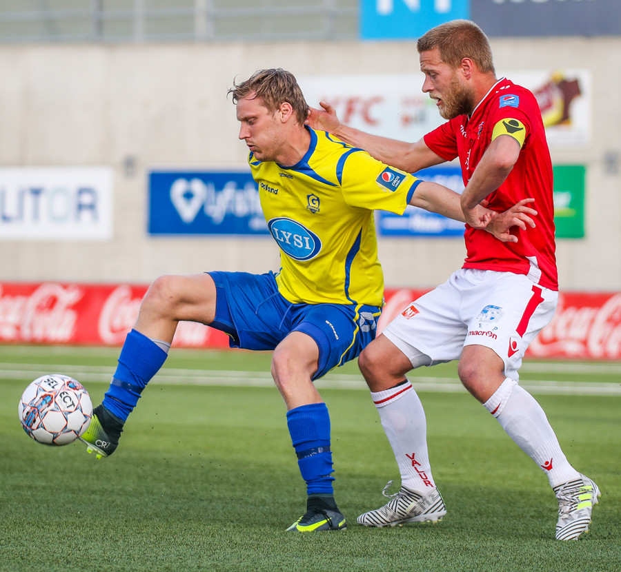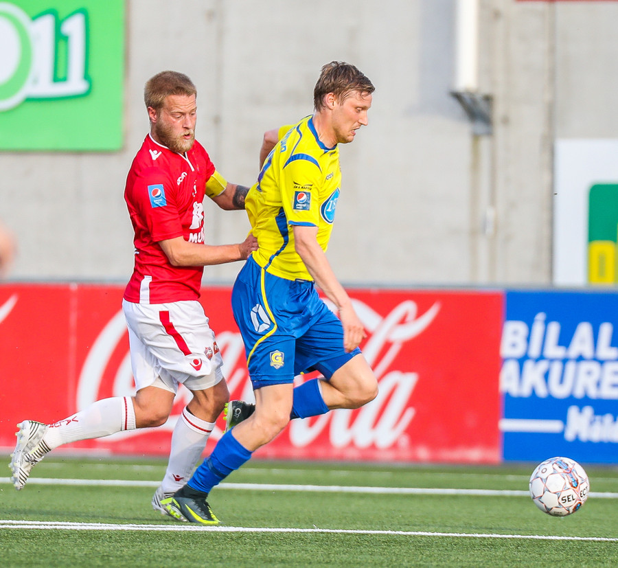 Tvöfalt dauðafæri hjá Bögild! Patrick Pedersen hefur betur gegn Gunnari Þorsteinssyni og kemst upp hægri kantinn.