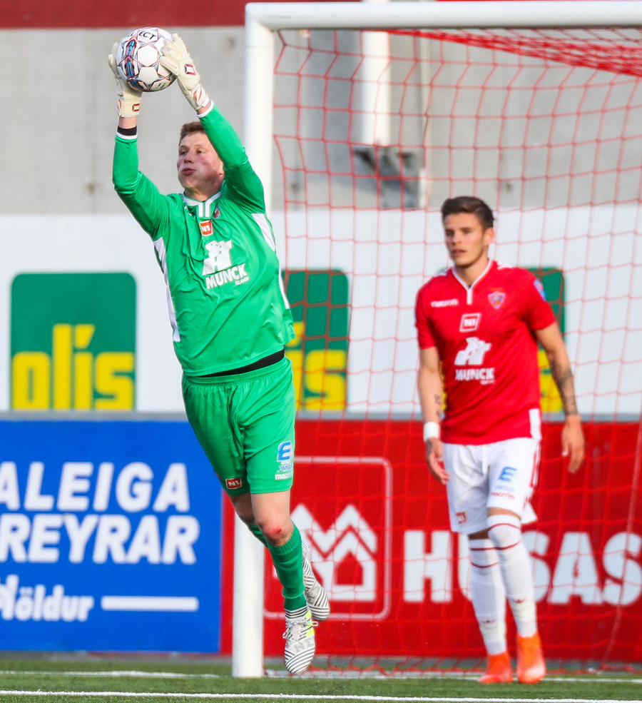 Patrick kemst aftur upp hægri kantinn og aftur á hann lága fyrirgjöf. Bögild er skrefi og seinn inn á teiginn og Jajalo nær að handsama boltann.