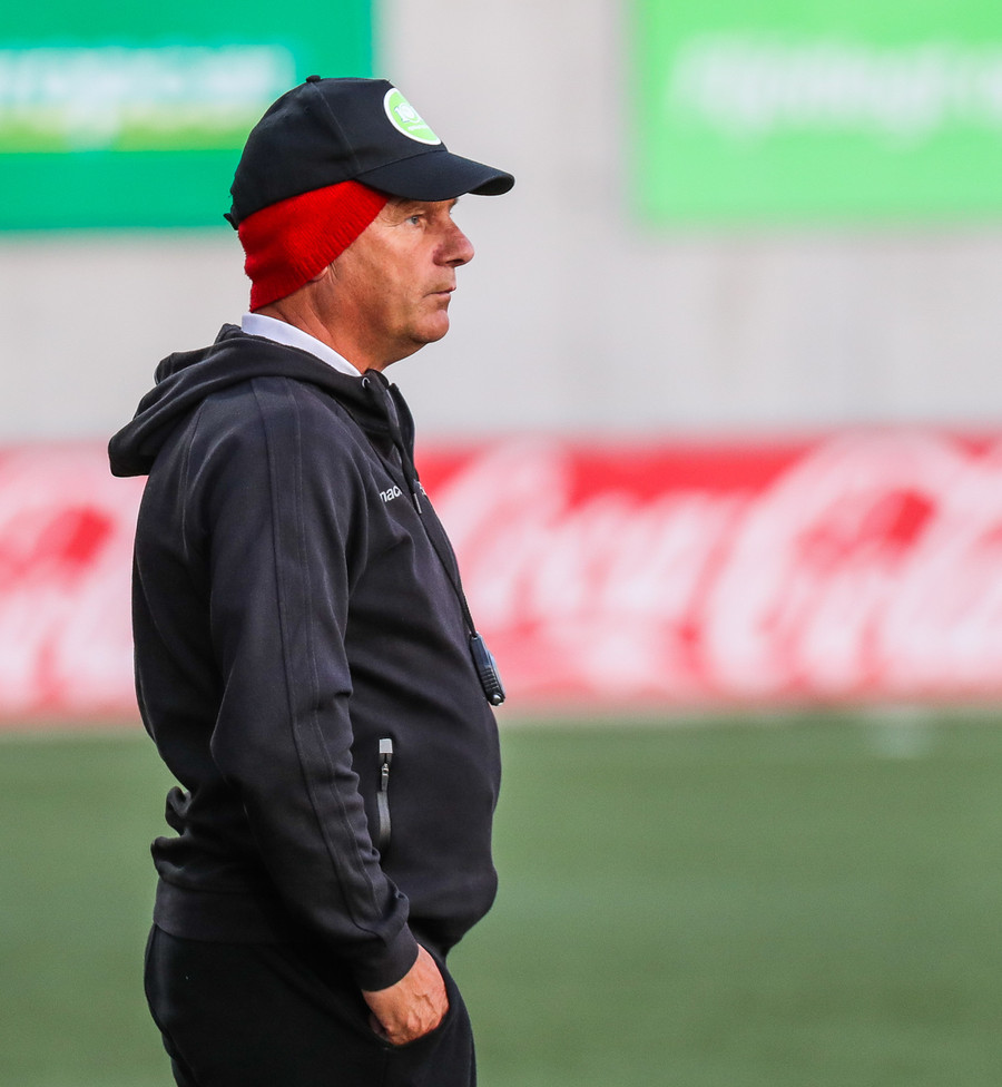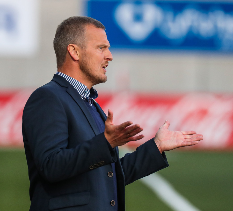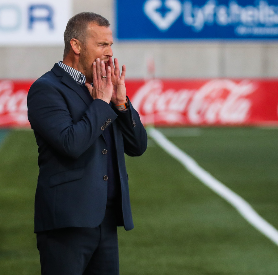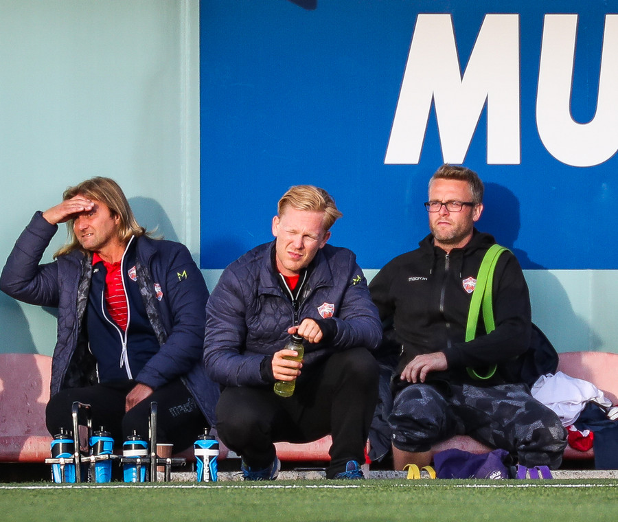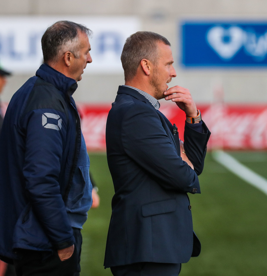 Grindvíkingar ætla að gera breytingu hér í hálfleik. Will Daniels fær skilaboð frá Milan Stefán Jankovic aðstoðarþjálfara. Janko kann leikinn upp á 10 og Daniels fær góð ráð frá honum.