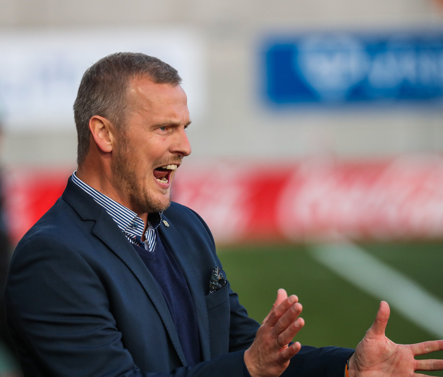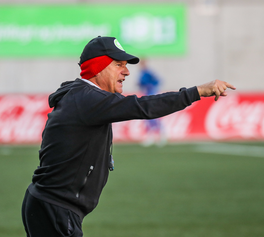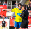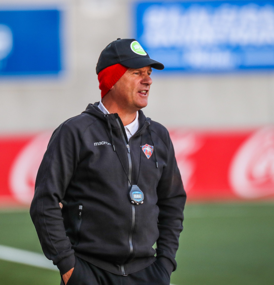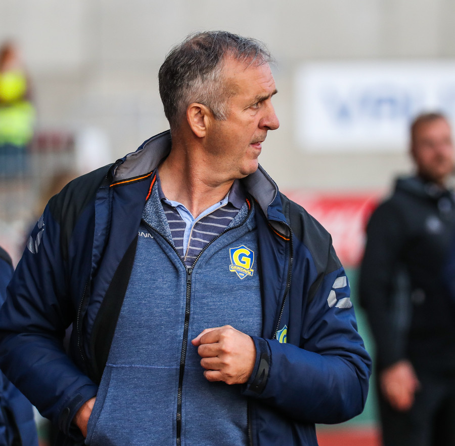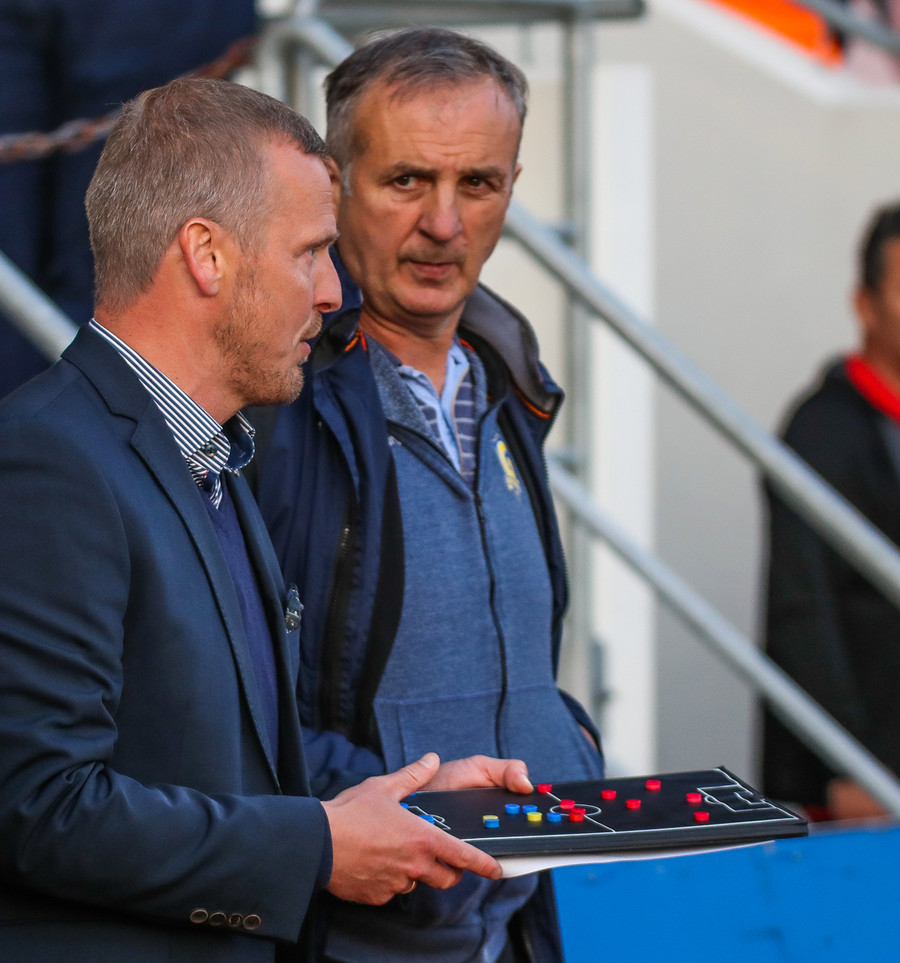 Grindvíkingar ætla að gera breytingu hér í hálfleik. Will Daniels fær skilaboð frá Milan Stefán Jankovic aðstoðarþjálfara. Janko kann leikinn upp á 10 og Daniels fær góð ráð frá honum.