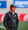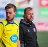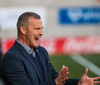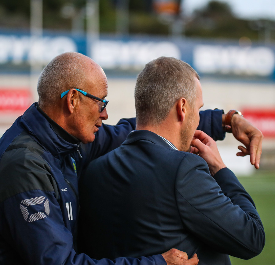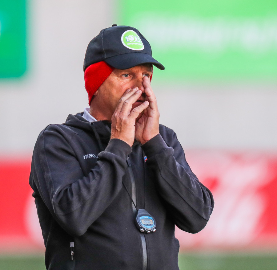 Þorsteinn Magnússon, markmannsþjálfari Grindvíkinga, og Sigurbjörn Hreiðarsson, aðstoðarþjálfari Vals, spjalla saman og hlæja mikið. Steini er mættur í markmannsgallann eftir að hafa verið úti á velli í jakkafötum áðan.
