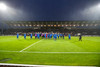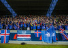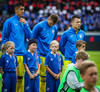 Bæði lið að sjálfsögðu í sínum aðalbúningum í kvöld. Íslendingar fallega bláir sem táknar víst ísinn í okkar fallega landi. Úkraníumenn gulir að vanda.
