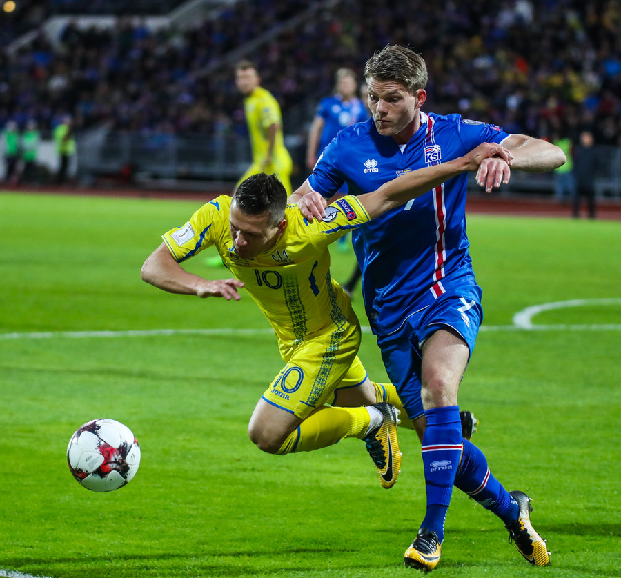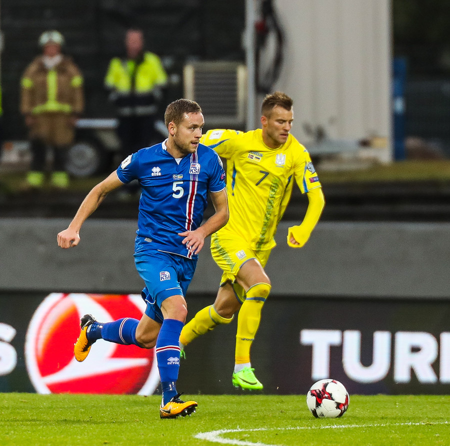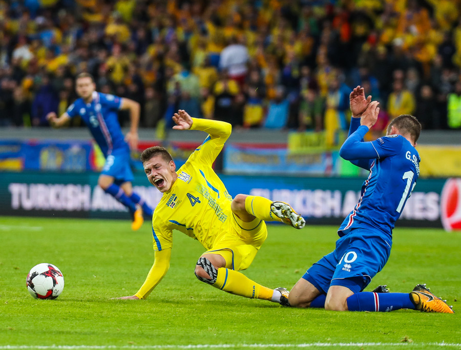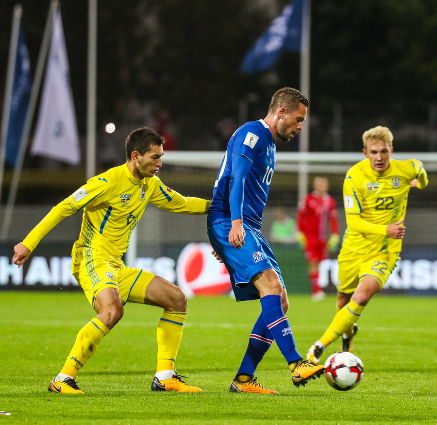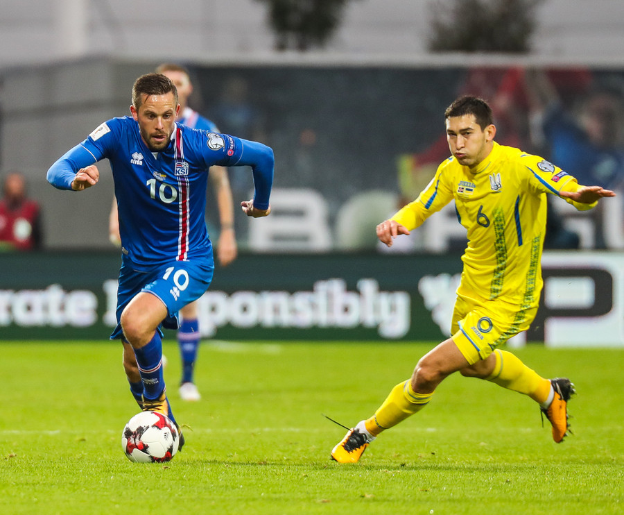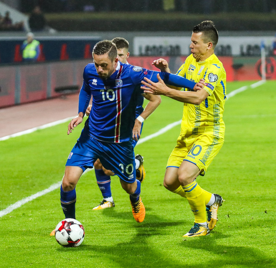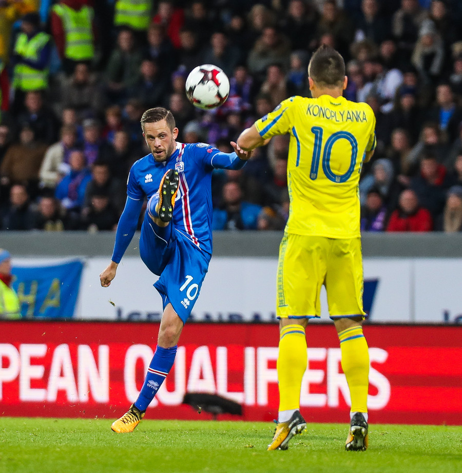 Fyrstu aukaspyrnu leiksins fá gestirnir. Gylfi Þór brýtur á Yarmolenko sem liggur í smá stund en stendur síðan upp.