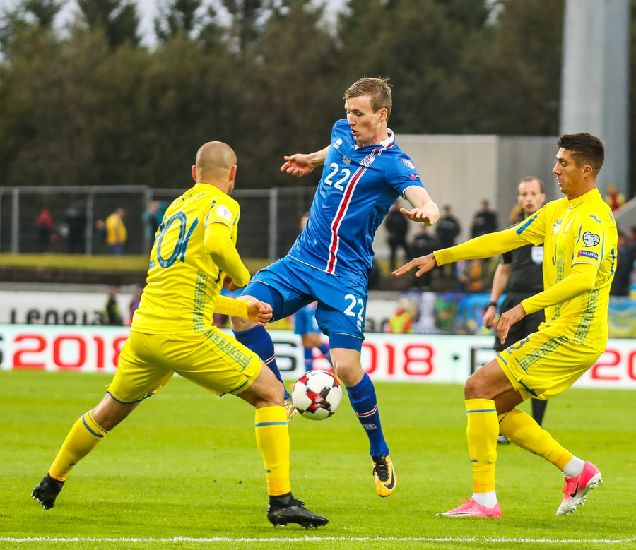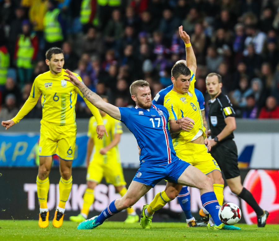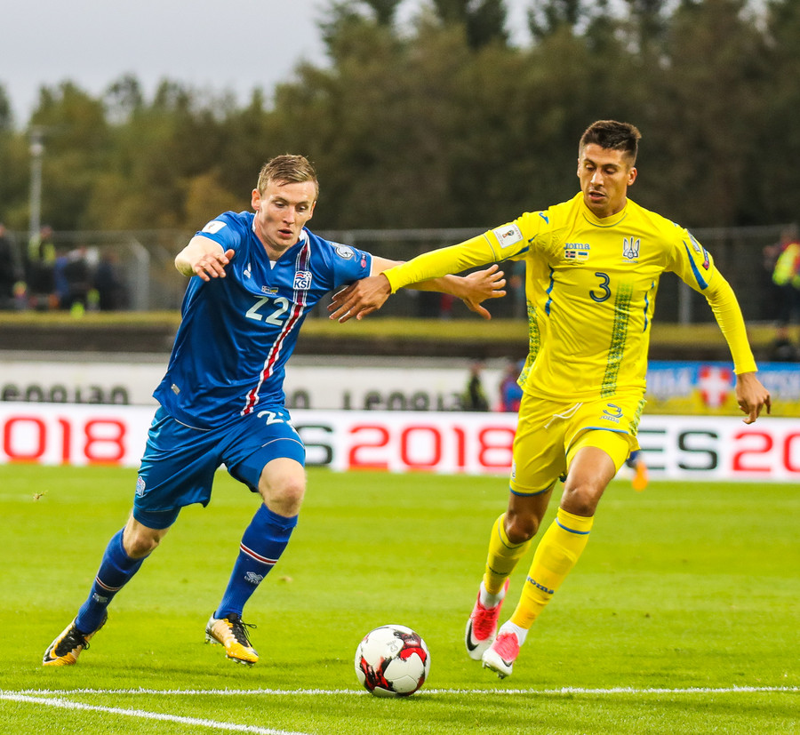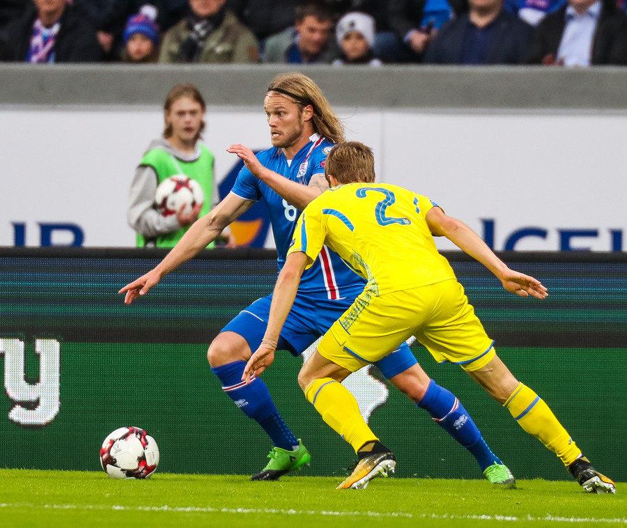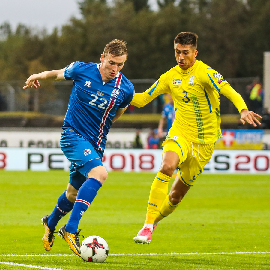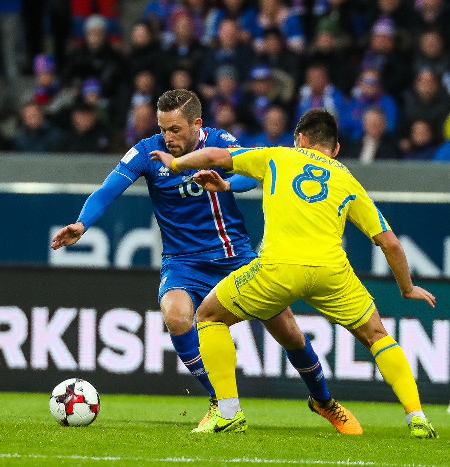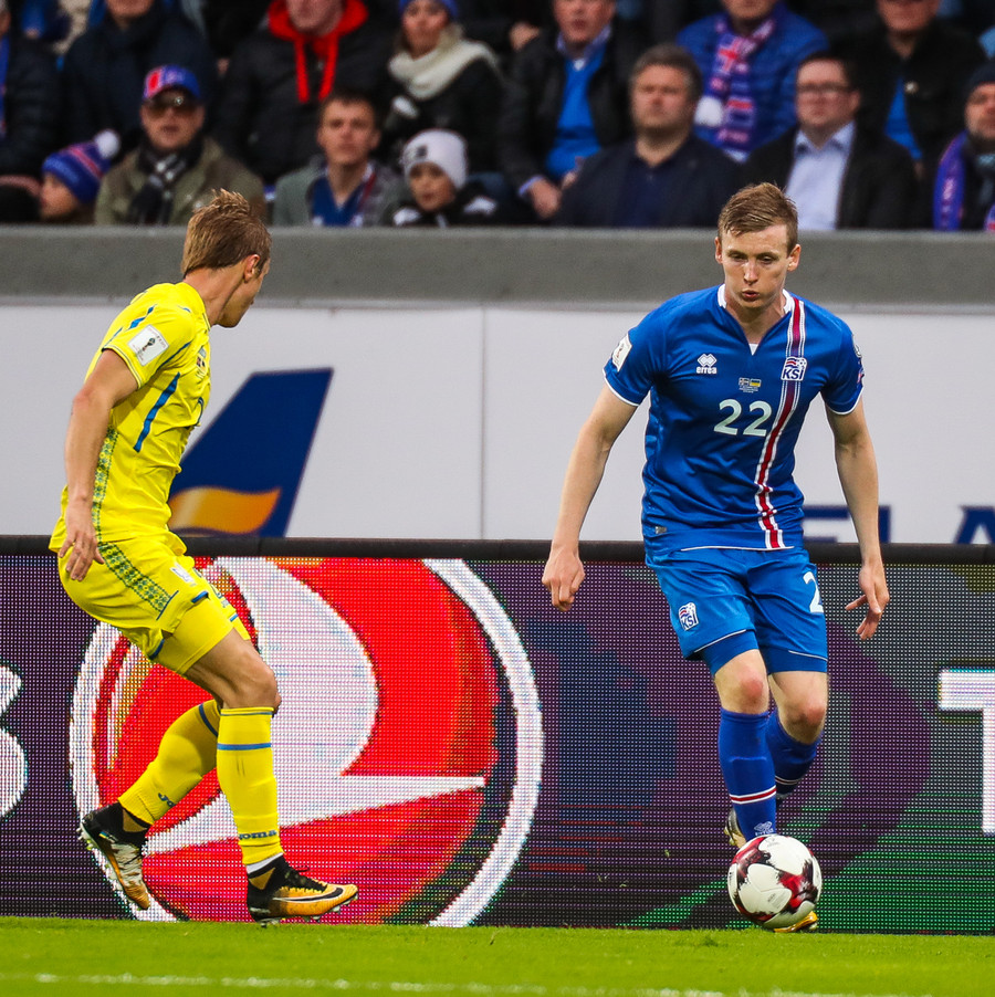 Fyrstu aukaspyrnu leiksins fá gestirnir. Gylfi Þór brýtur á Yarmolenko sem liggur í smá stund en stendur síðan upp.