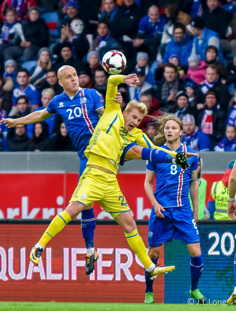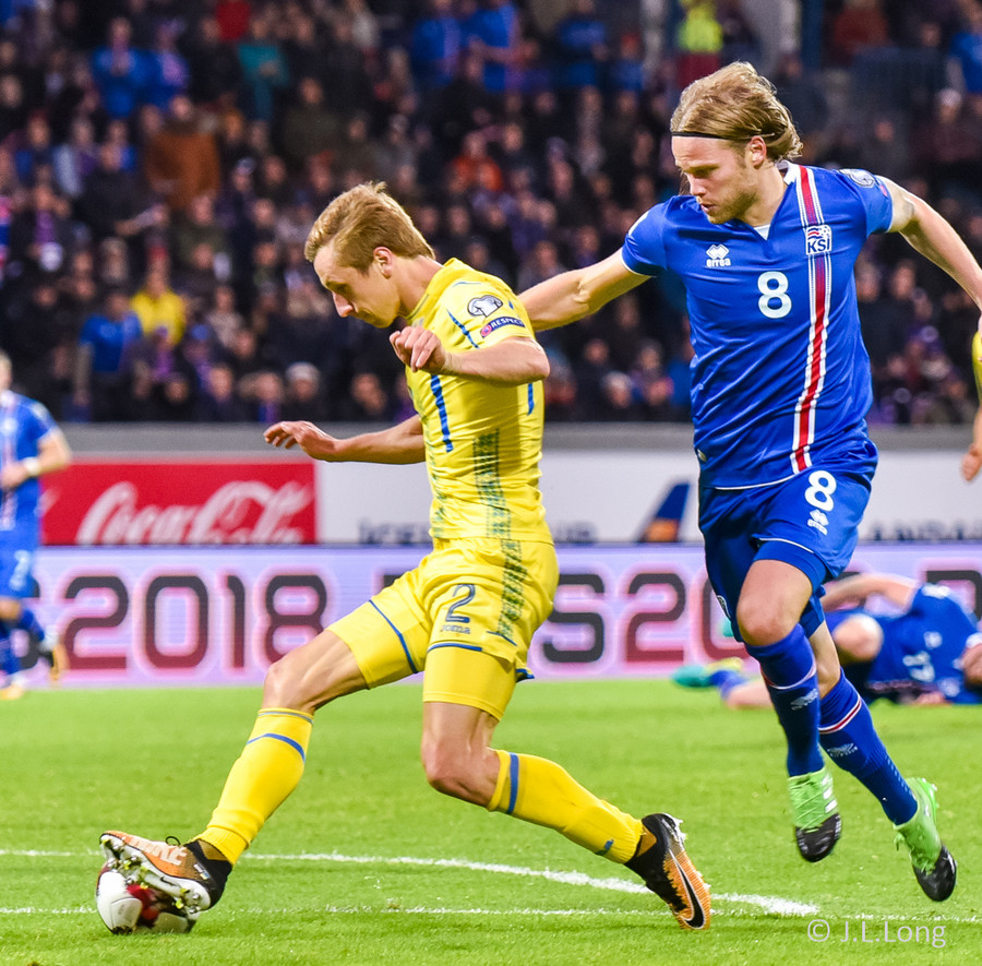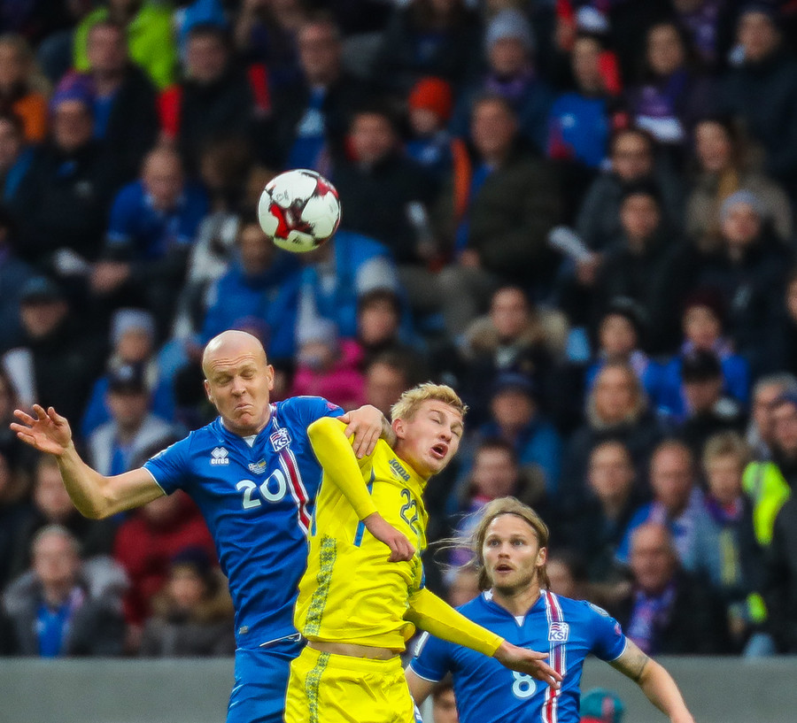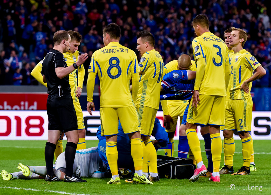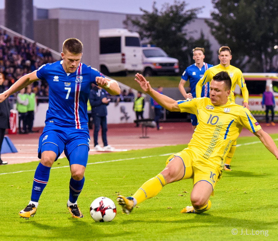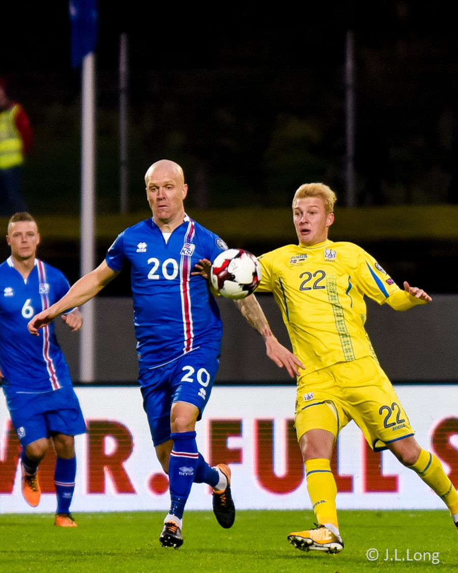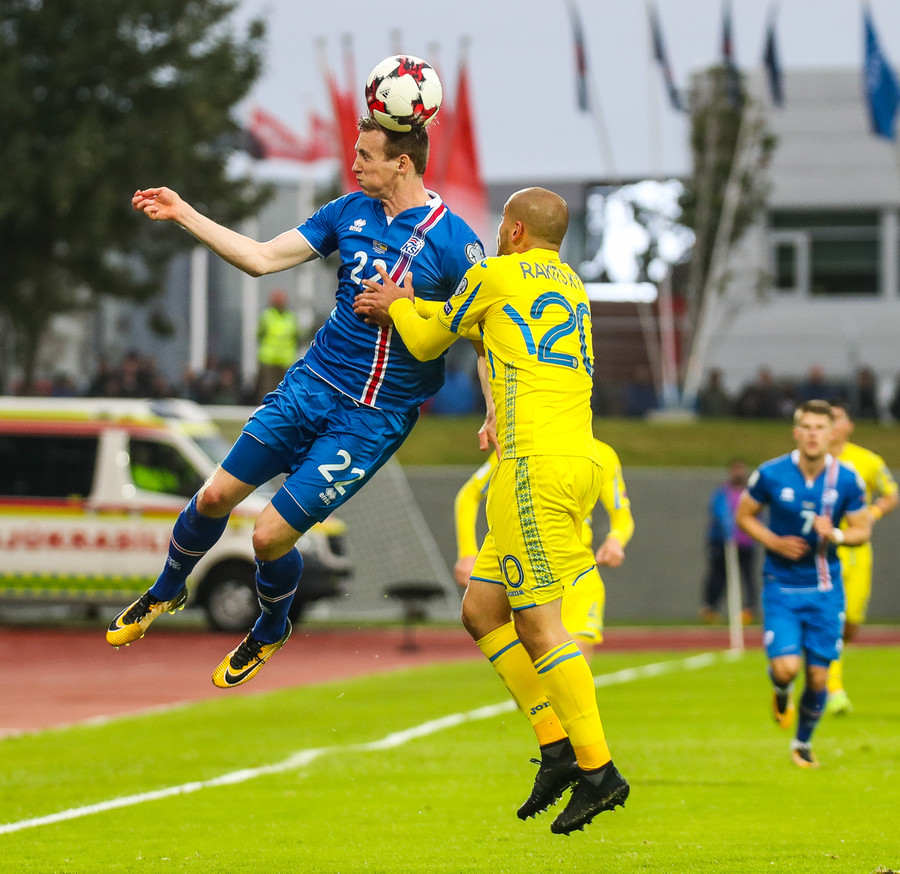Fyrstu aukaspyrnu leiksins fá gestirnir. Gylfi Þór brýtur á Yarmolenko sem liggur í smá stund en stendur síðan upp.