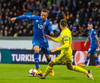 Hörður Björgvin kominn meðal fremstu manna og keyrir upp völlinn. Ætlar að reyna að stinga honum innfyrir á Björn Bergmann en Pyatov búin að lesa þetta og kemur út og sparkar boltanum burt.