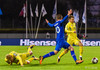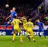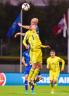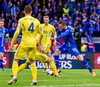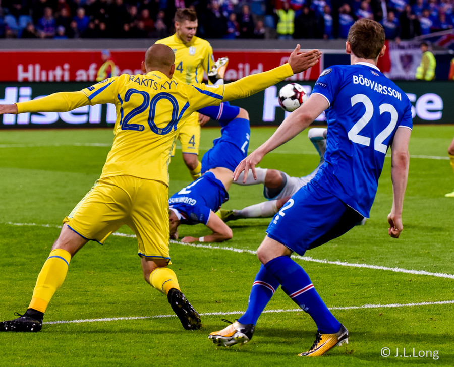 Taras Stepanenko með arfaslakt skot rétt fyrir utan teig. Leikmenn Úkraníu pirraðir út í hann.