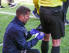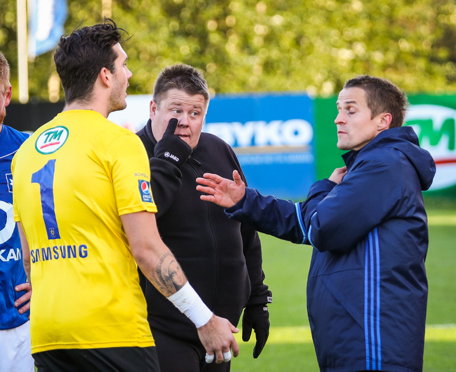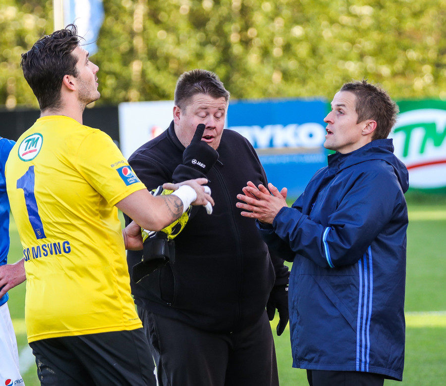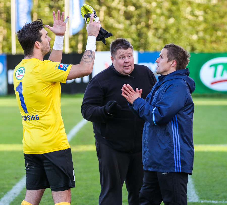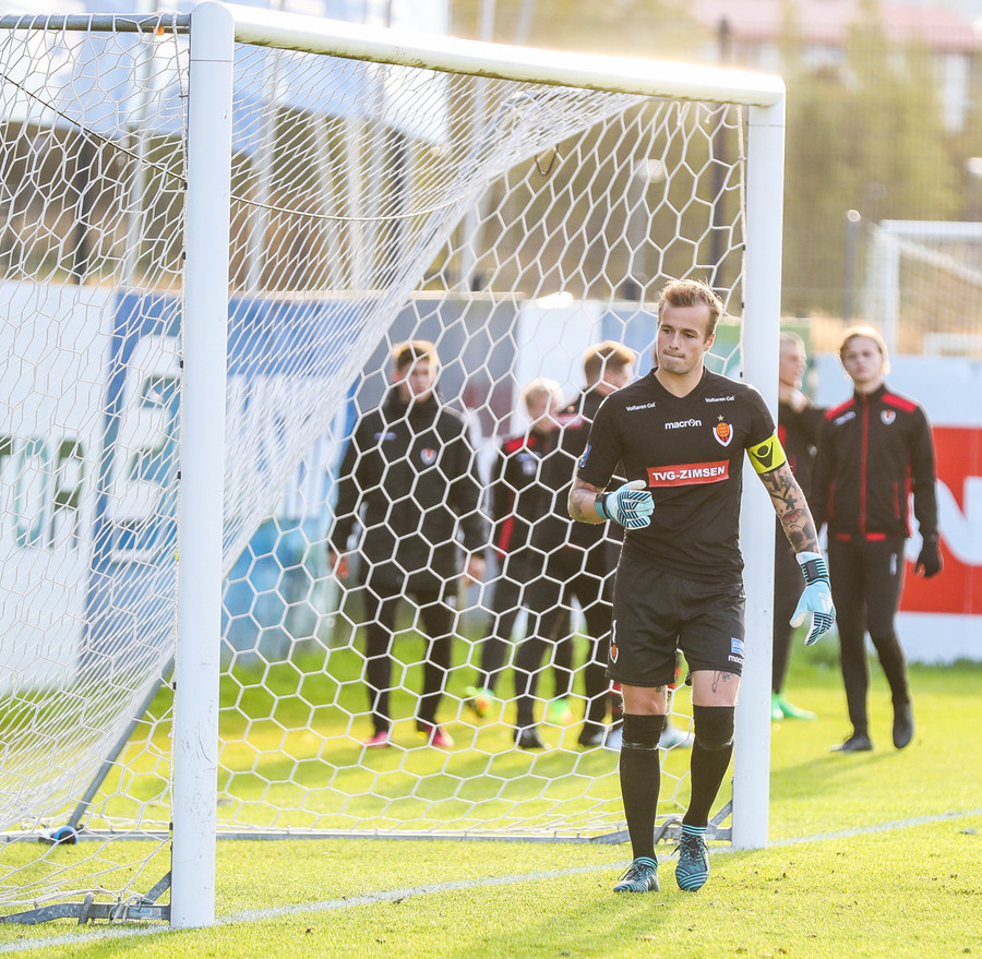 Fjalar Þorgeirsson markvarðaþjálfari náði þó að hemja skap sitt og verður við hlið Rúnars í leiknum í dag.
