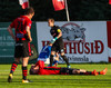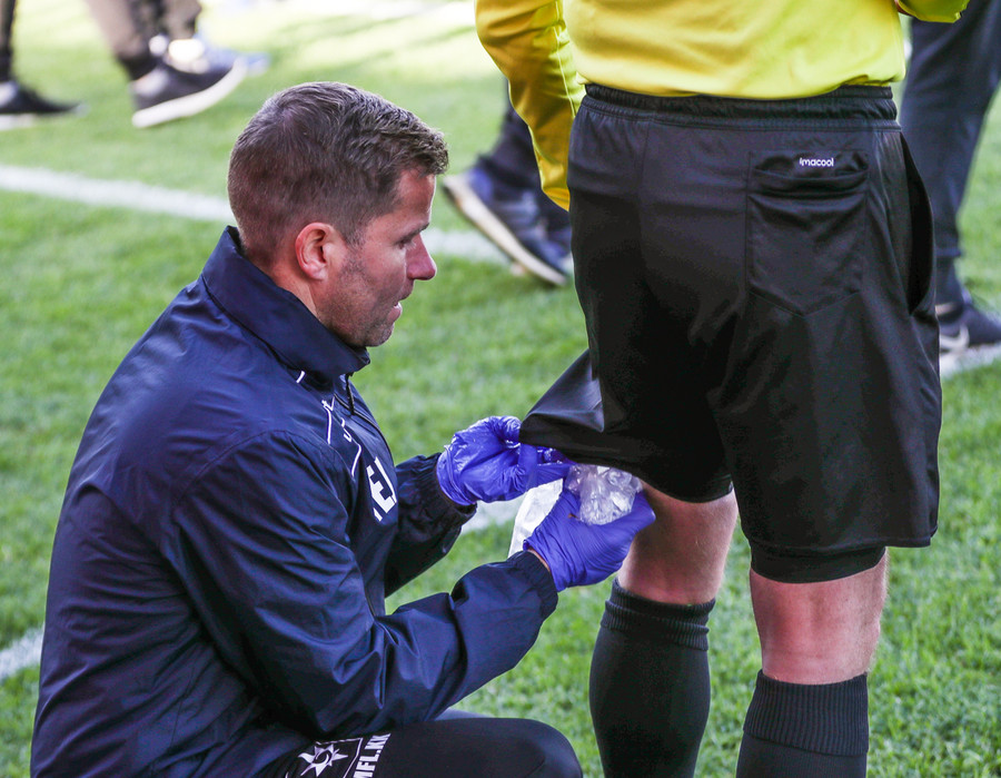 Róló lenti í árekstri og liggur eftir á vellinum. Þarf aðhlynningu. Stjörnumenn baula og telja að hann sé að tefja. "Spjaldaðu hræið" öskraði einn úr stúkunni.