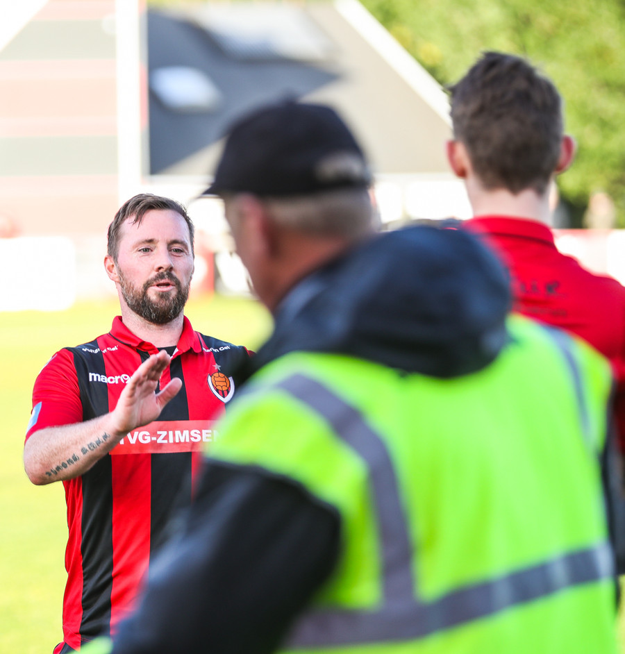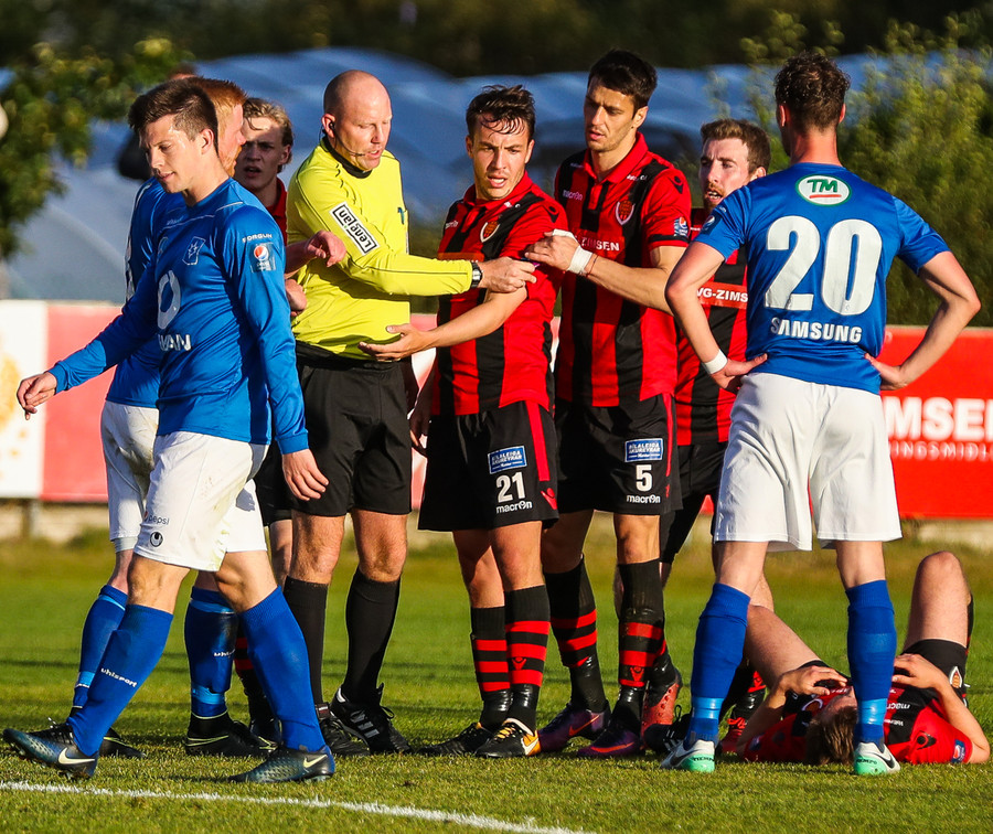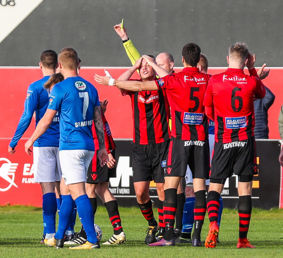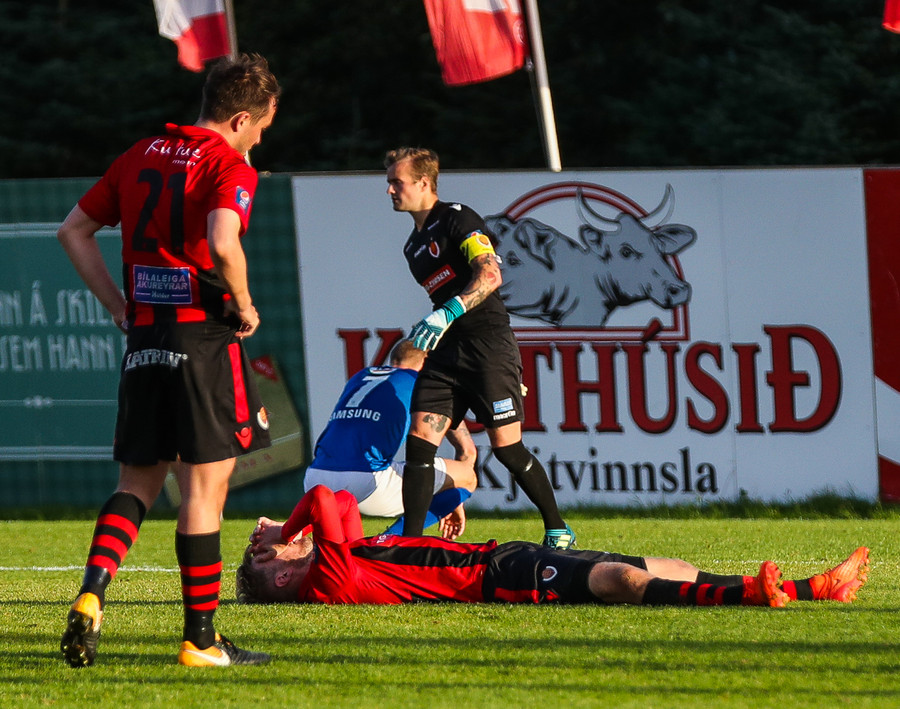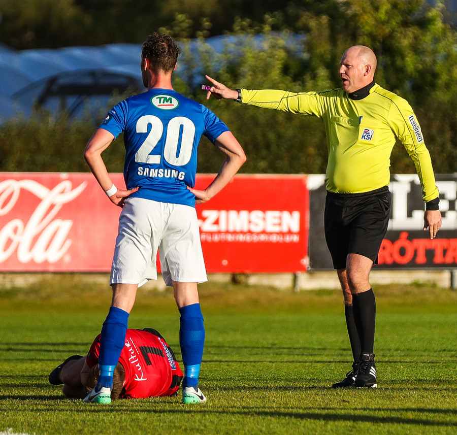 Hólmbert brýtur á Ívari Erni sem öskrar duglega þar sem hann liggur í grasinu. Stuðningsmenn Víkinga pirraðir út í Gunnar Jarl dómara sem lætur Hólmbert sleppa með tiltal.