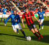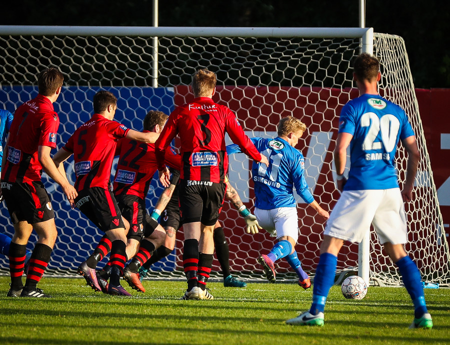 Guðjón Baldvins dansar í kringum varnarmenn i teignum og nær lausu skoti sem Róló á ekki í vandræðum með.