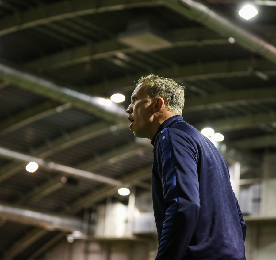 Svo er þakið líka eitthvað að þvælast fyrir Björk sem dúndrar boltanum upp í loft úr útsparki.