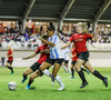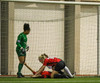 Stefanía Ásta tekur aukaspyrnuna. Þrumar boltanum framhjá veggnum en Chante á markmannshornið og grípur þetta.