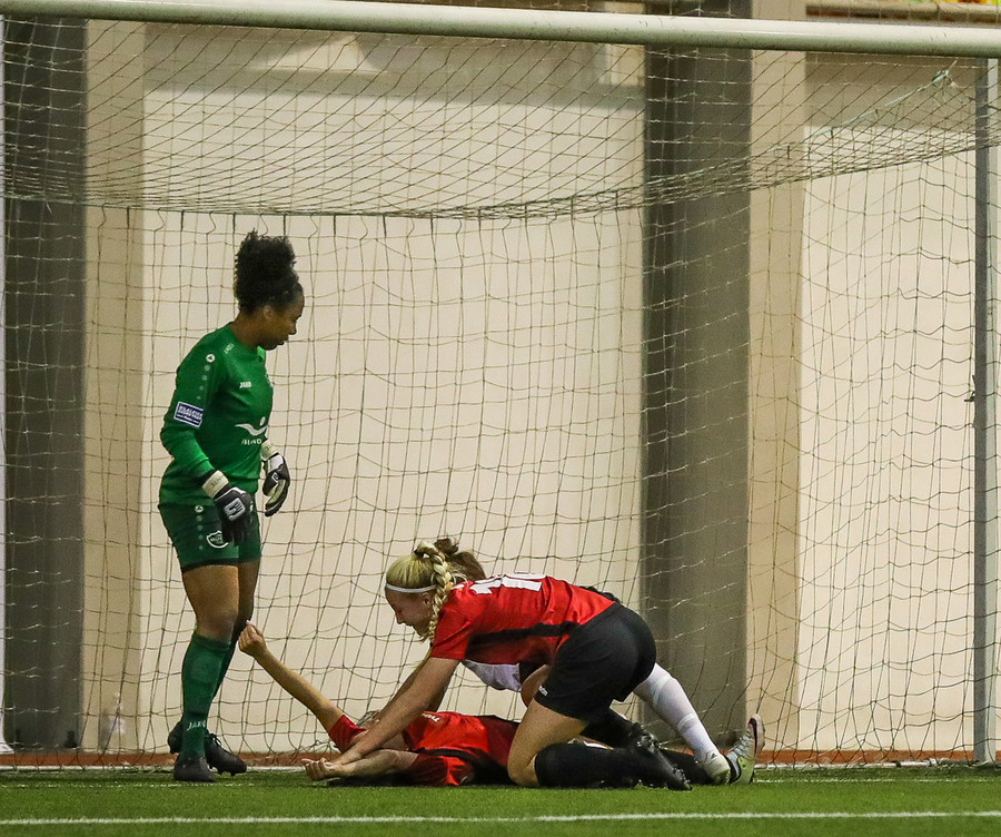 Óþolandi snúningur á boltanum á þessu gervigrasi og ómögulegt fyrir leikmenn að reikna hann út stundum. Vorkenndi Karólínu þarna. Hún vann tæklingu en boltinn skaust svo bara eitthvert lengst í burtu og það sem hefði getað orðið efnileg sókn varð að engu.