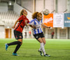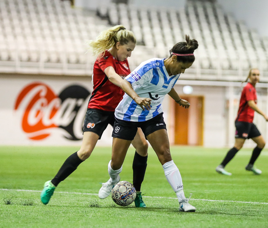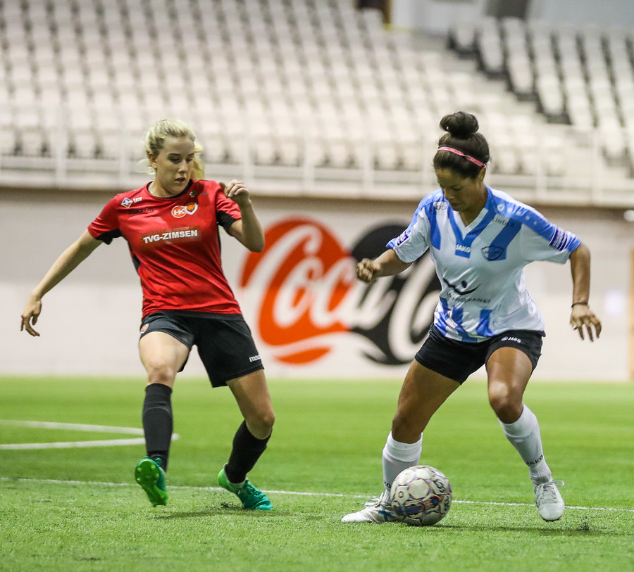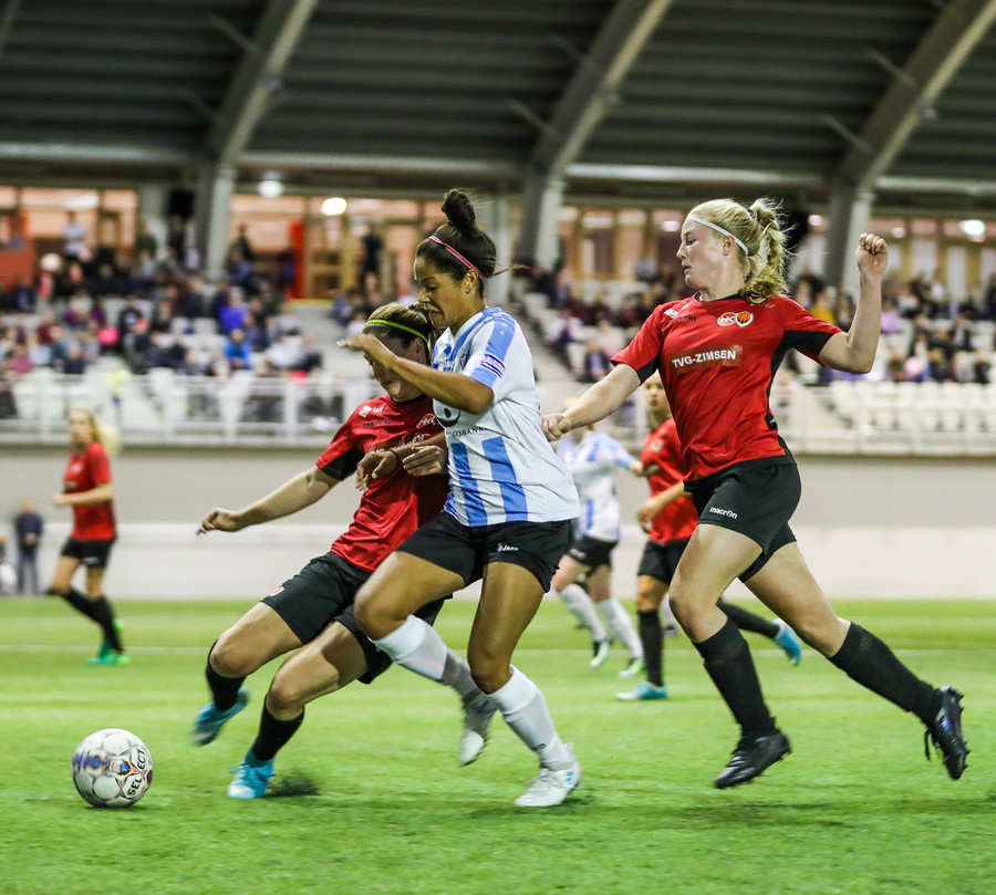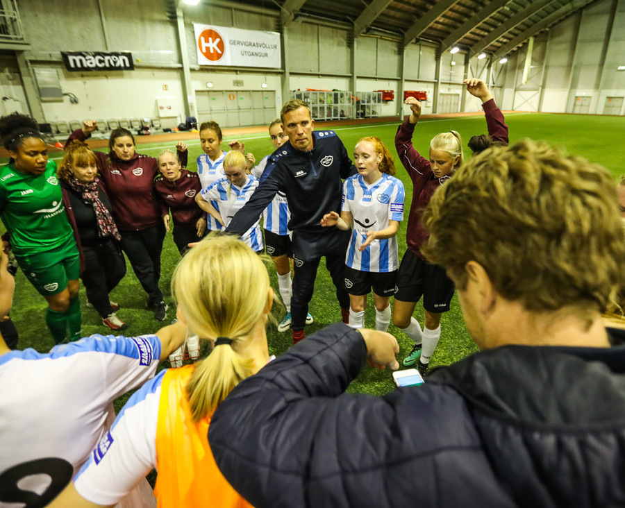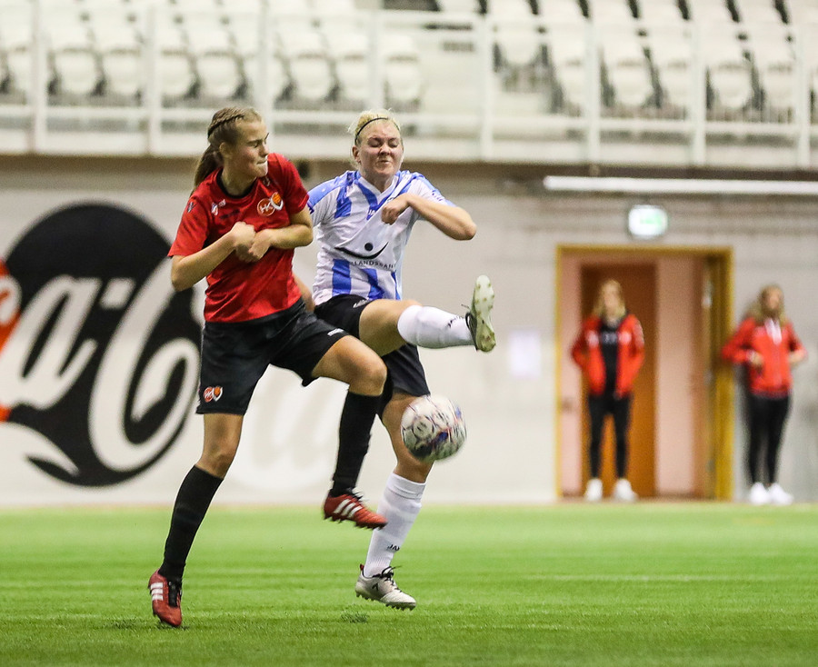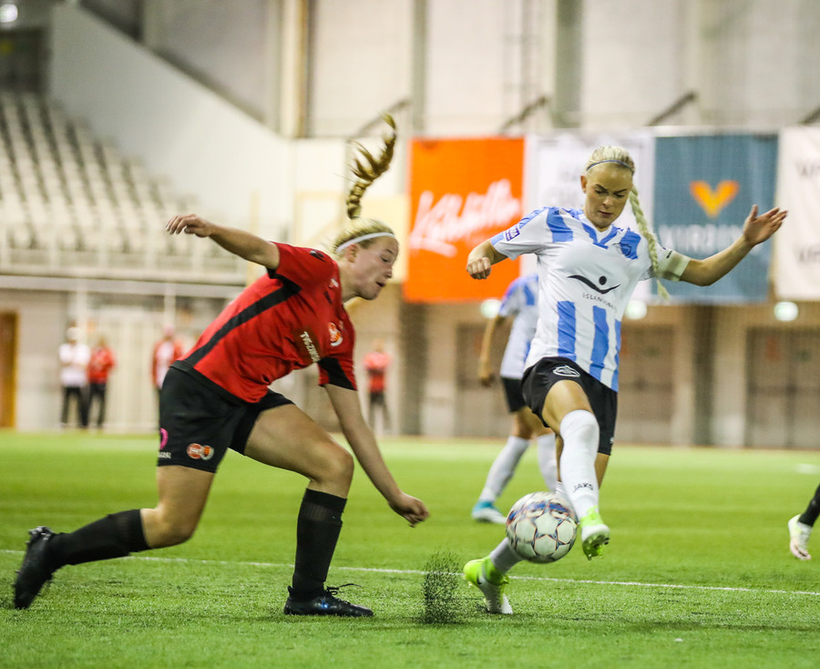 Staðan er orðin 1-0 fyrir HK/Víkingum. Chante mistókst að halda fyrirgjöf frá vinstri og missti boltann undir pressu frá Karólínu Jack. Boltinn datt niður við markið en Karólína var úr jafnvægi og of langt frá til að nýta mistökin.
