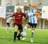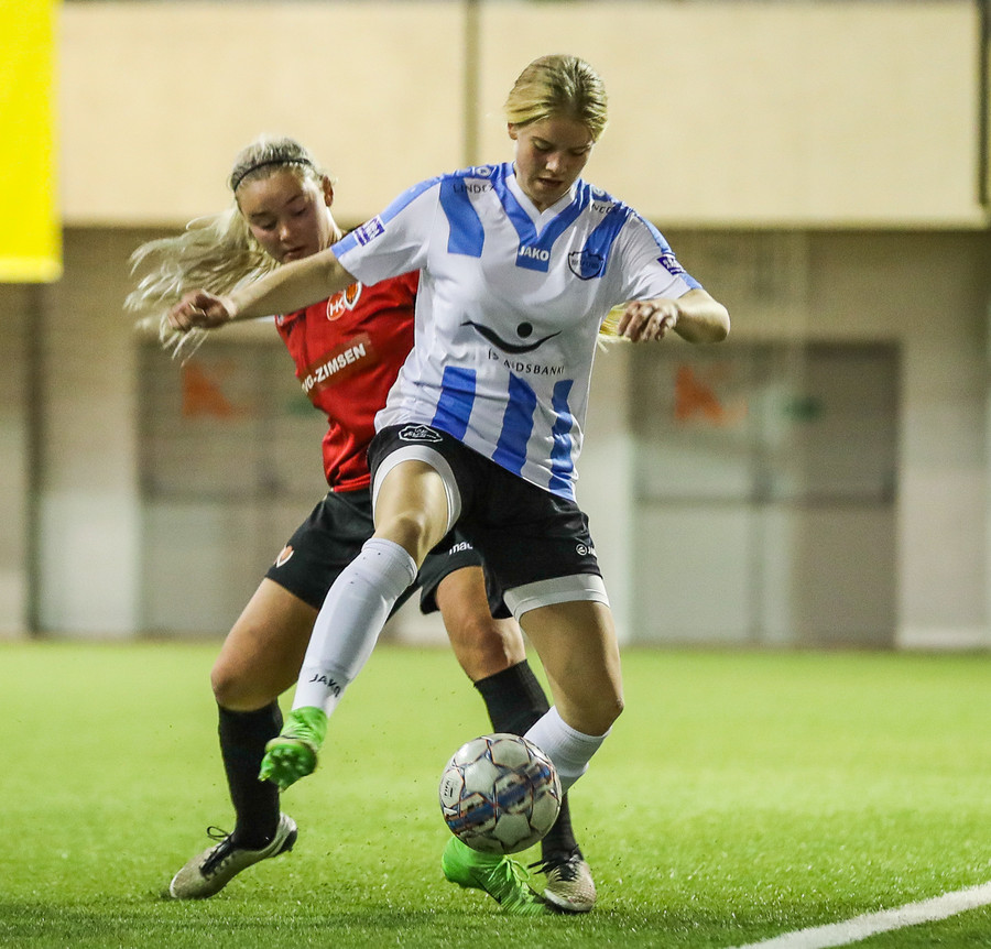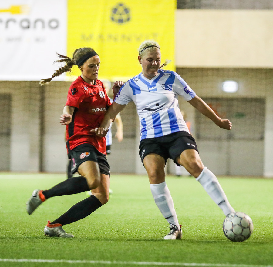 Er fljót út úr markinu og nær að hreinsa áður en að hin eldfljóta Ísafold náði til boltans í teignum.