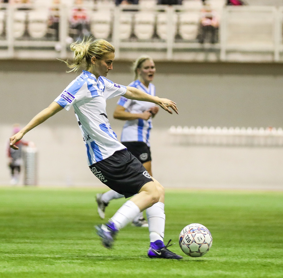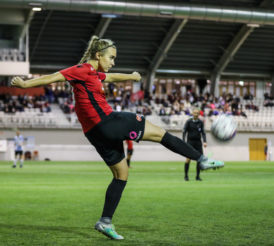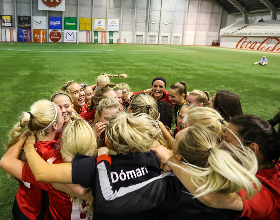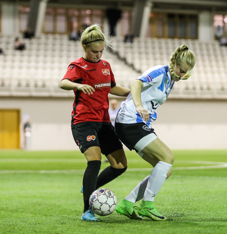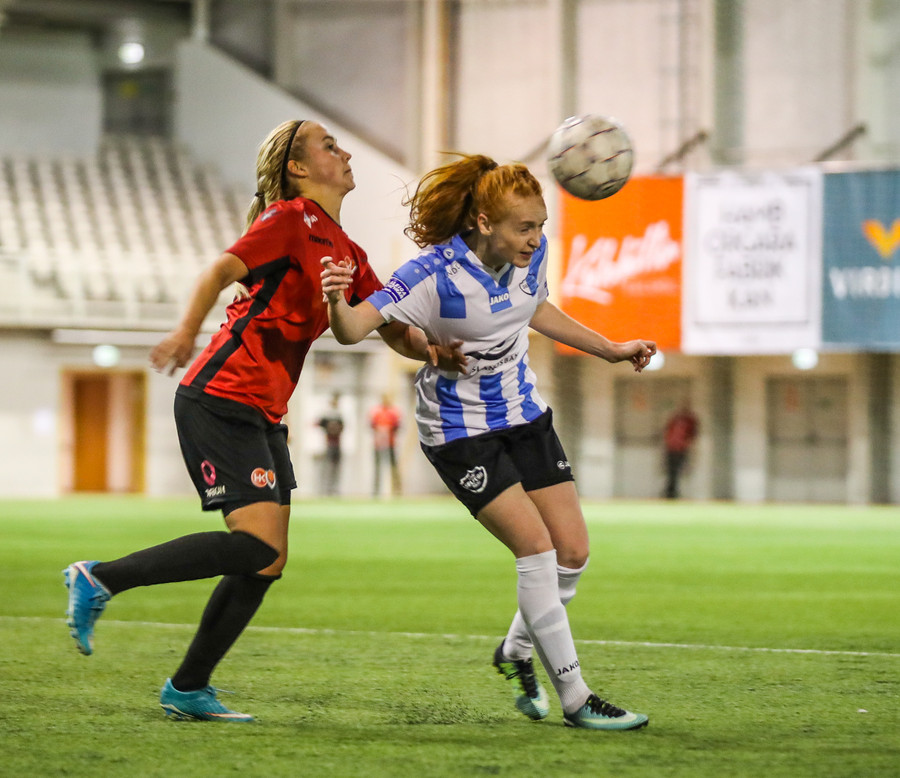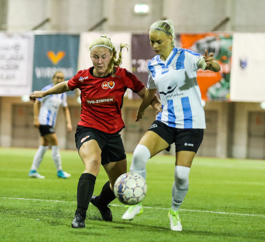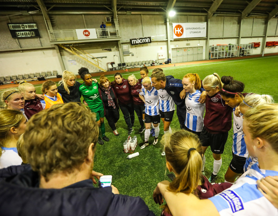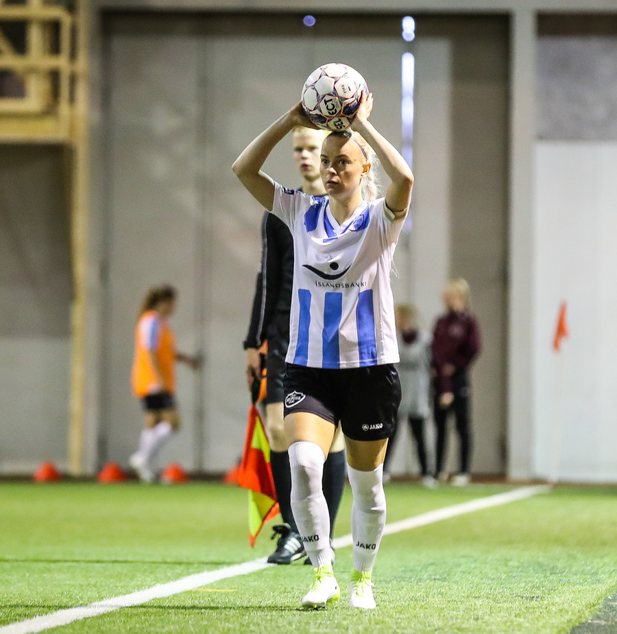 Þær fá dæmda aukaspyrnu hægra megin við vítateig HK/Víkings. Anna María setur fastan bolta fyrir markið þar sem Kristrún mætir ákveðin en skallar yfir.