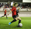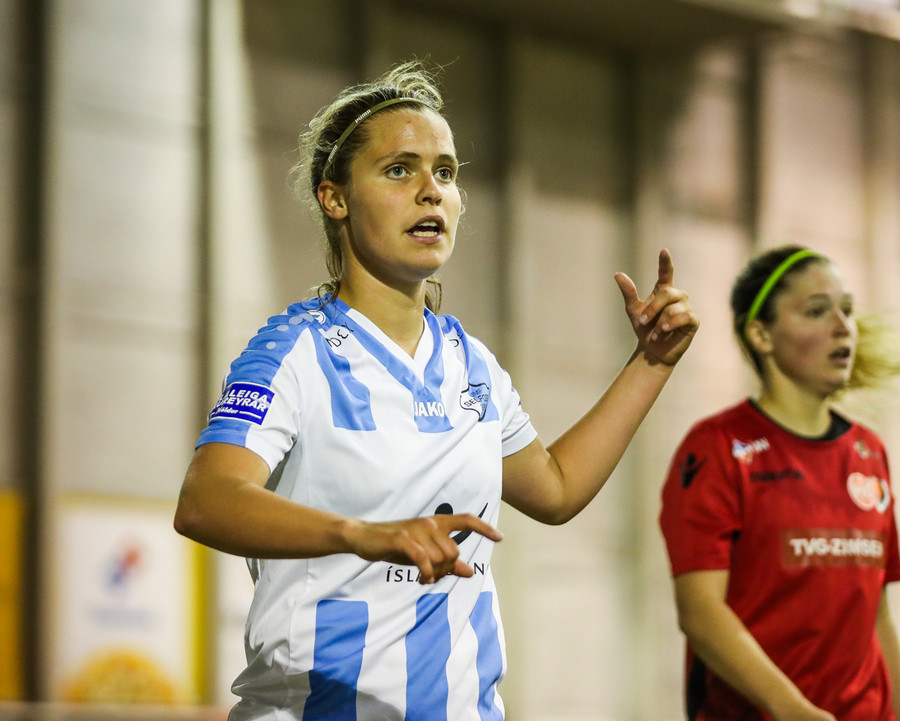 Halldóra skapar hættu með sinni fyrstu snertingu. Skallar fyrirgjöf Alugas rétt yfir. Kraftur í henni.