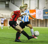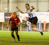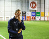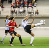 Stúkan syngur "Inn með boltann" og þarna munar litlu. Fyrirliðinn Anna María setur boltann fyrir og á hausinn á Alex Alugas sem skallar að marki en varnarmaður HK/Víkings kemst fyrir.
