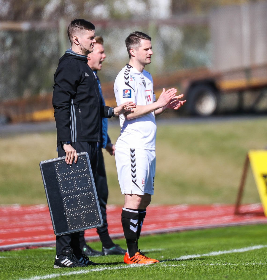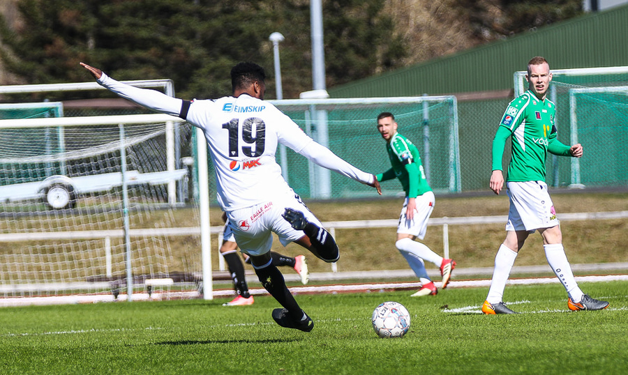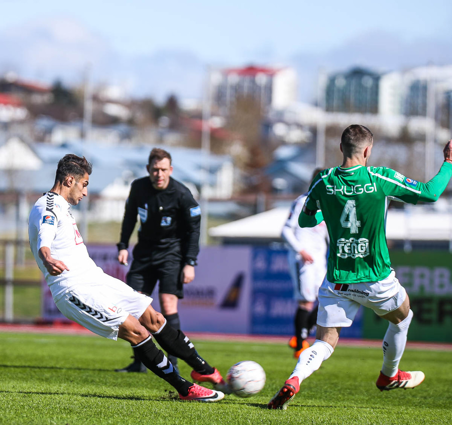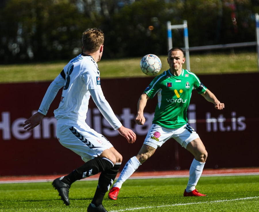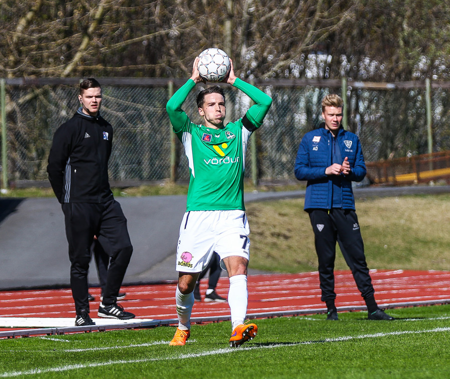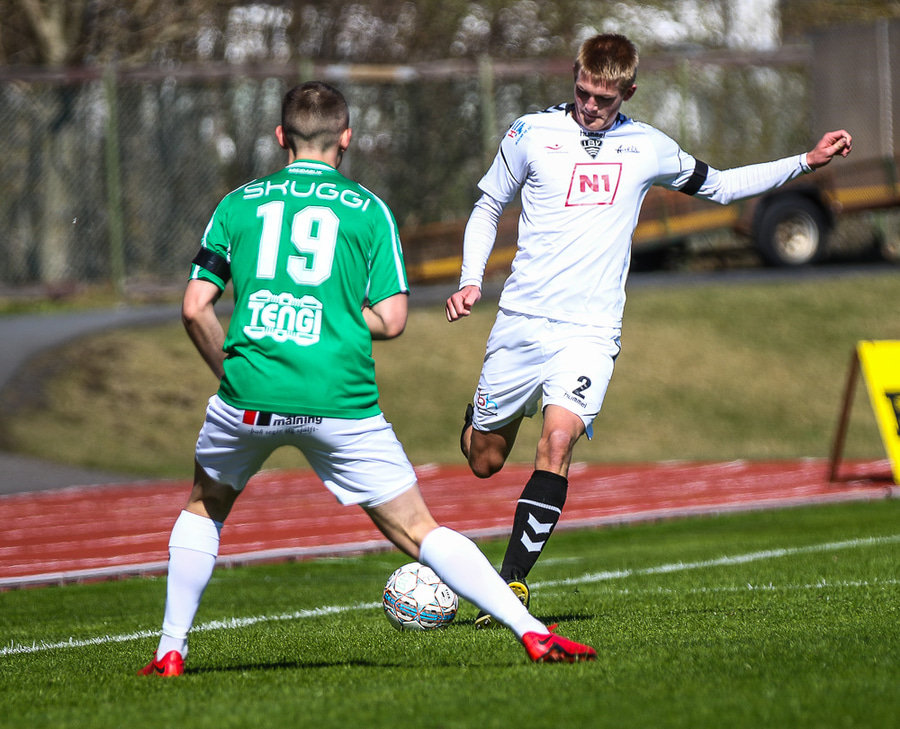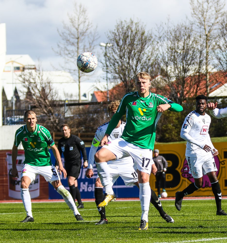 Arnþór Ari reynir fyrirgjöf frá hægri en guð minn almáttugur. Hann skóflar boltanum líklega 30 metra upp í loftið og aftur fyrir markið.