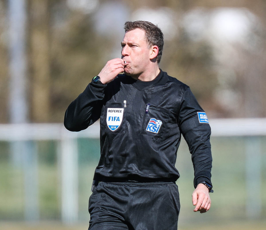 Willum Þór fellur innan teigs en Þóroddur segir unga stráknum bara að standa upp.