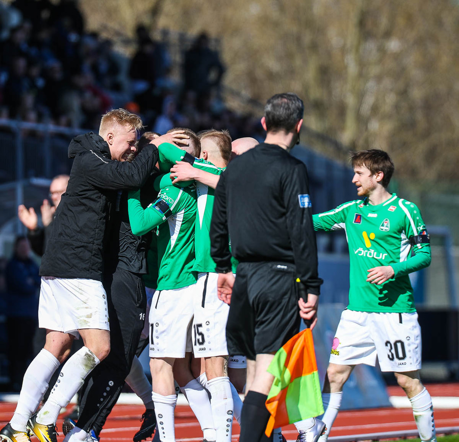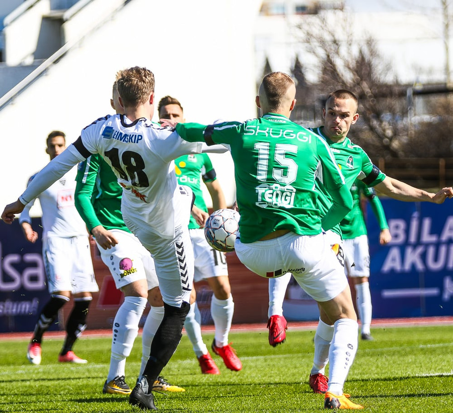 Dagur Austmann tók hornspyrnuna sem var föst og fór alveg yfir á fjærstöngina og gott betur en það. Erichot reyndi að ná til boltans en hafði ekki erindi sem erfiði.