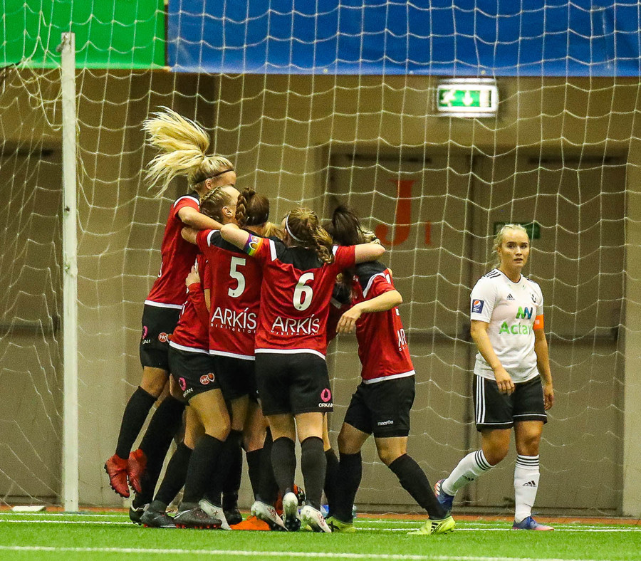 Margrét Sif reynir skot af 30 metra færi en það fer í varnarmann, spurning hvort hún hefði átt að gefa boltann frekar þarna. Dómarinn blæs til leikhlés. Nokkuð jafn leikur framan af en heimamenn hafa verið sterkari eftir markið.