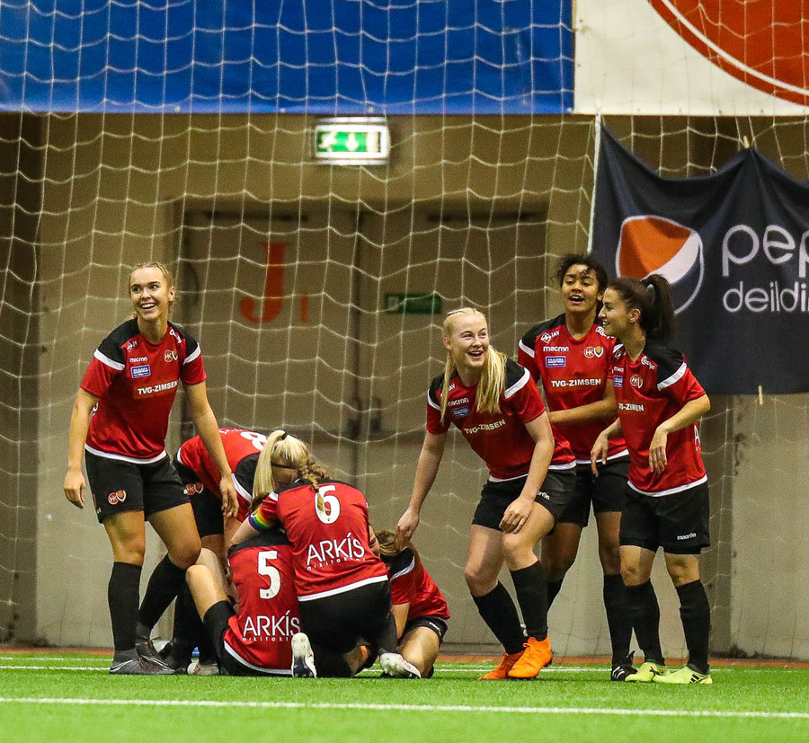HK/Víkingur fá annað horn eftir að þær komust í þrjár á þrjár í teig FH. Þær reuyna að leka eftir hornið á undan en í þetta sinn eru varnarmenn FH fyrri til. Talsvert meir kraftur heimakonum eftir markið.