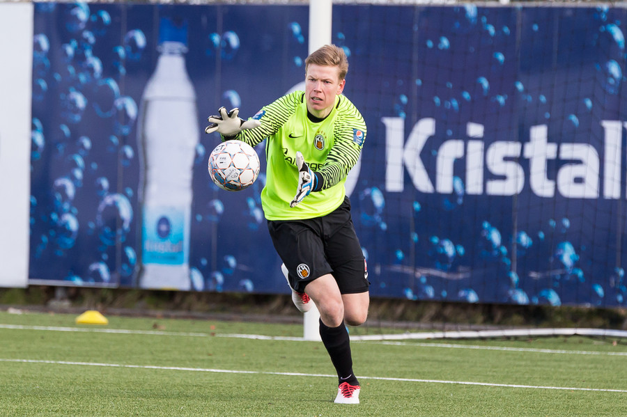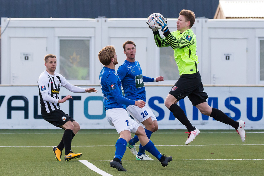 Boltinn alla leið yfir markið og Haraldur tekur boltann og stillir upp í markspyrnu frá marki sínu.