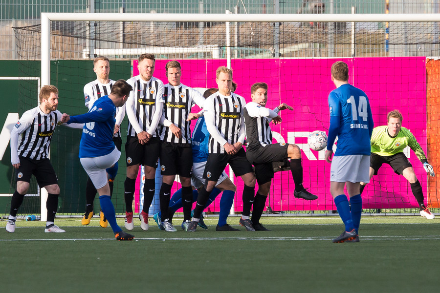 Þessi spyrna frá Hilmari Árna fer beint í vegginn og mikil barátta um boltann núna!