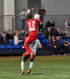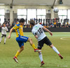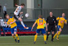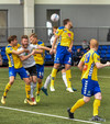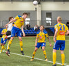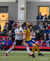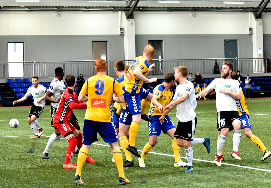 Hornspyrnan er fín og er Davíð Þór ekki langt frá því að ná að skalla hann í markið.