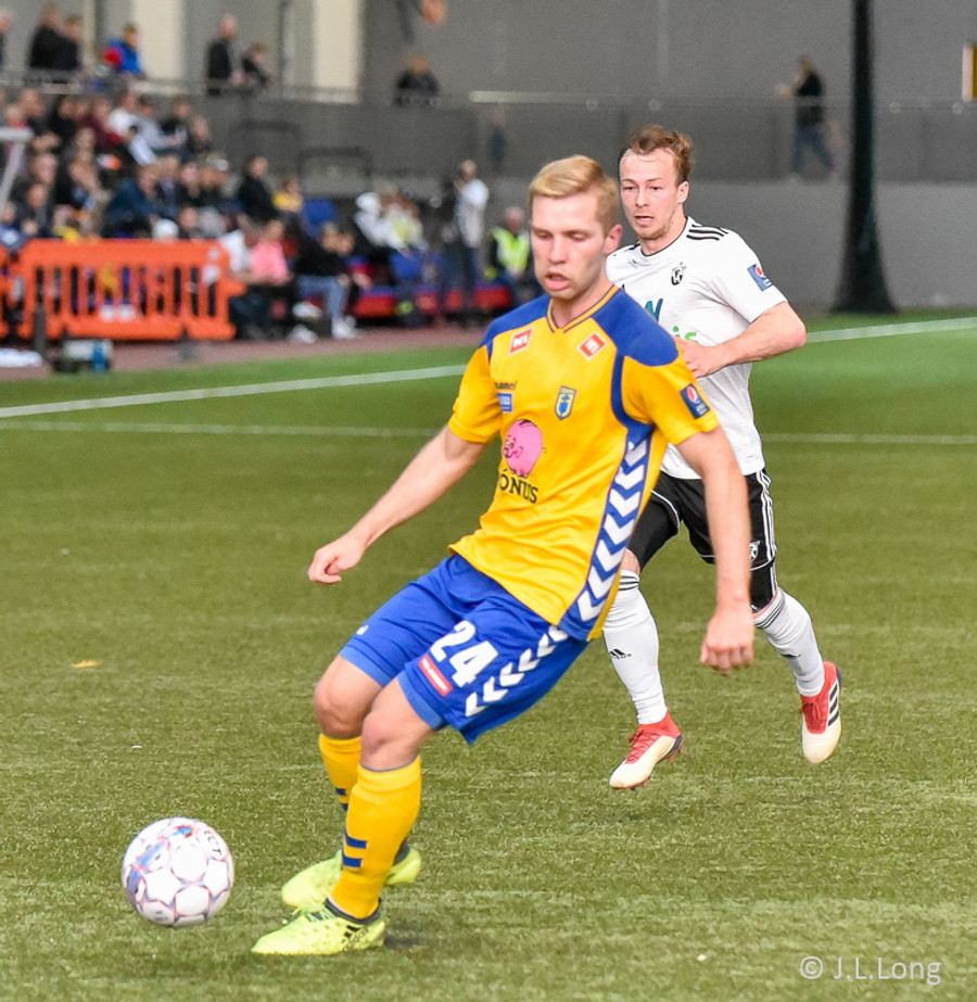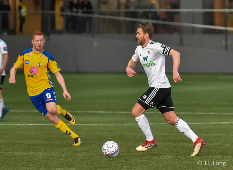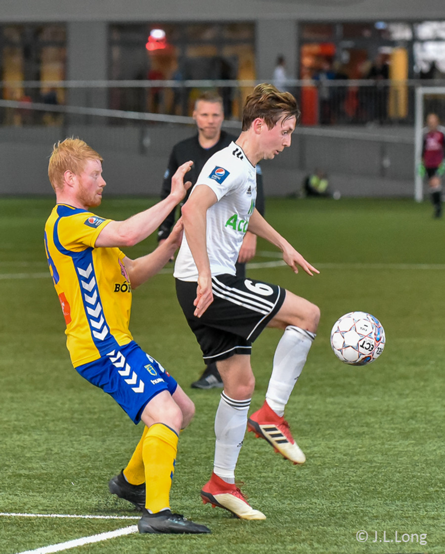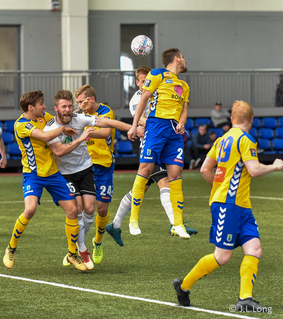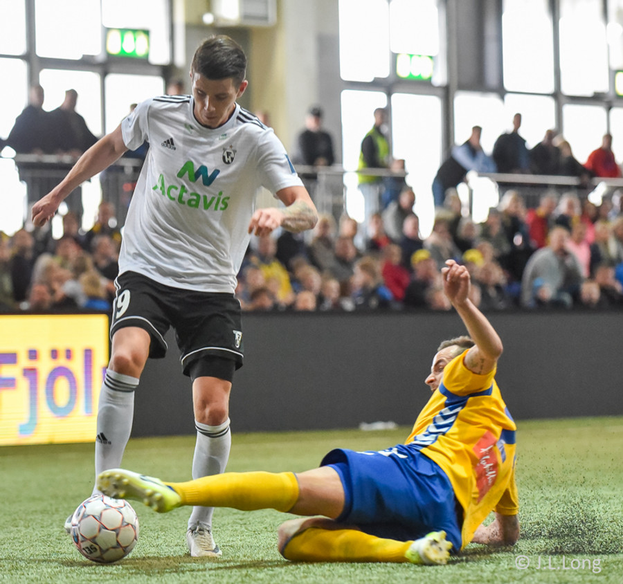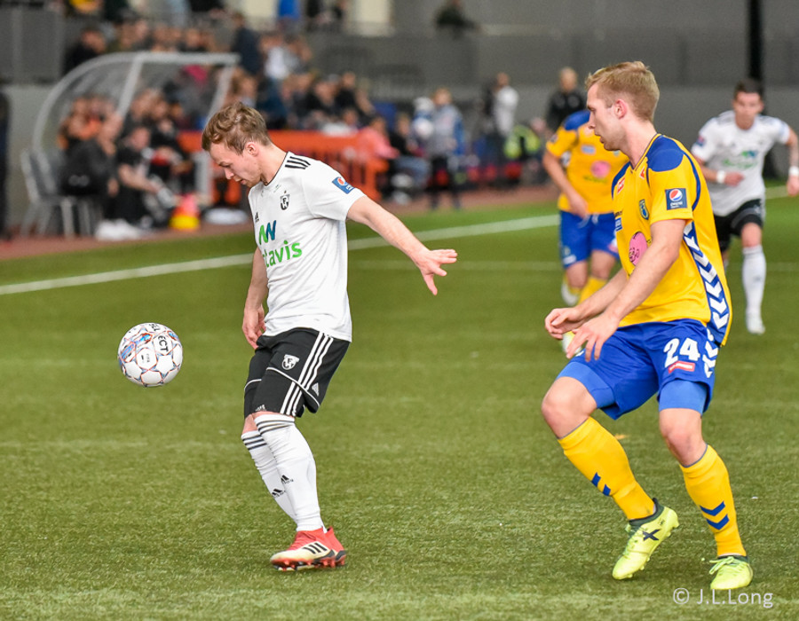 Birnir Snær með geggjaðan klobba á Robbie Crawford en skot hans fer svo beint í varnarmann. Stúkan hafði mjög gaman af þessu.