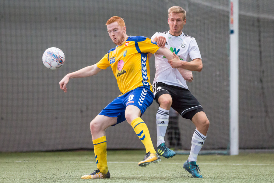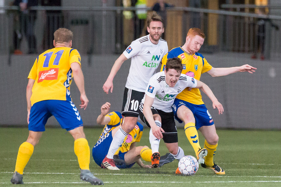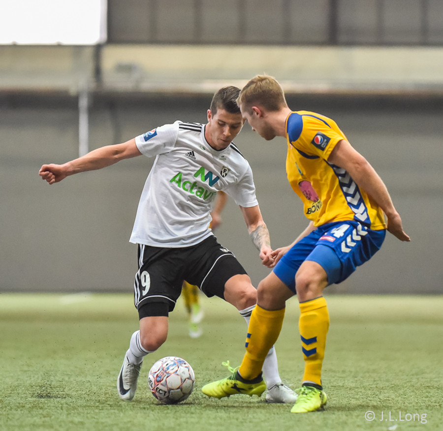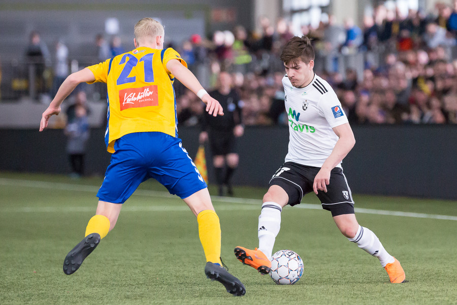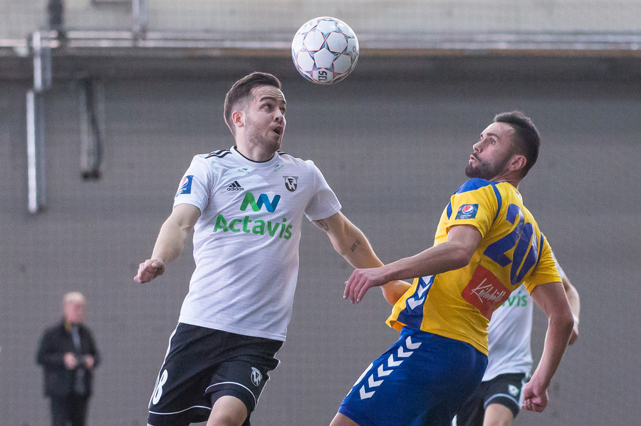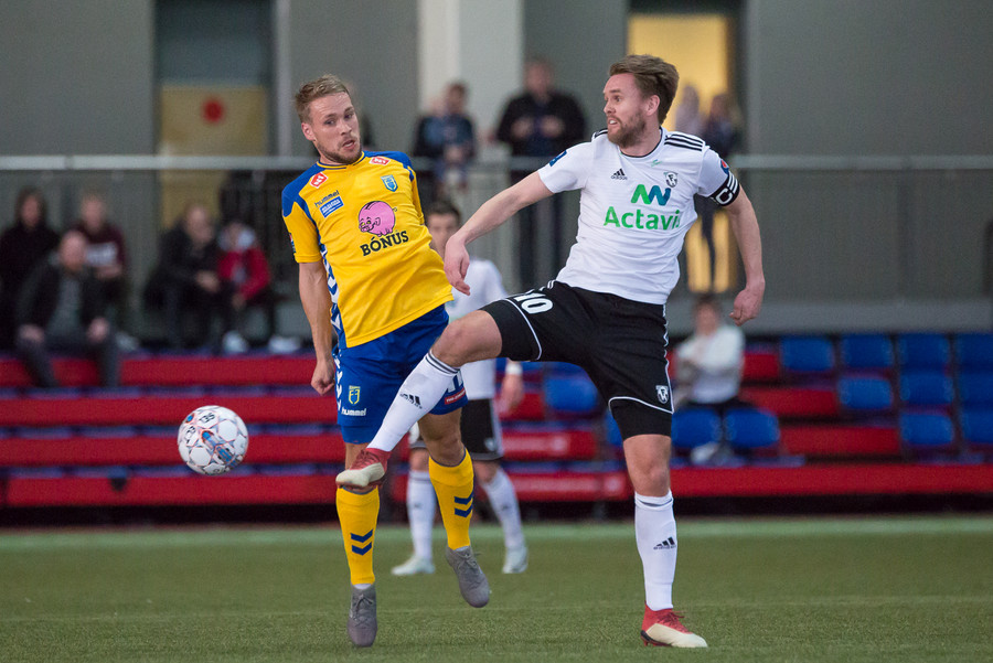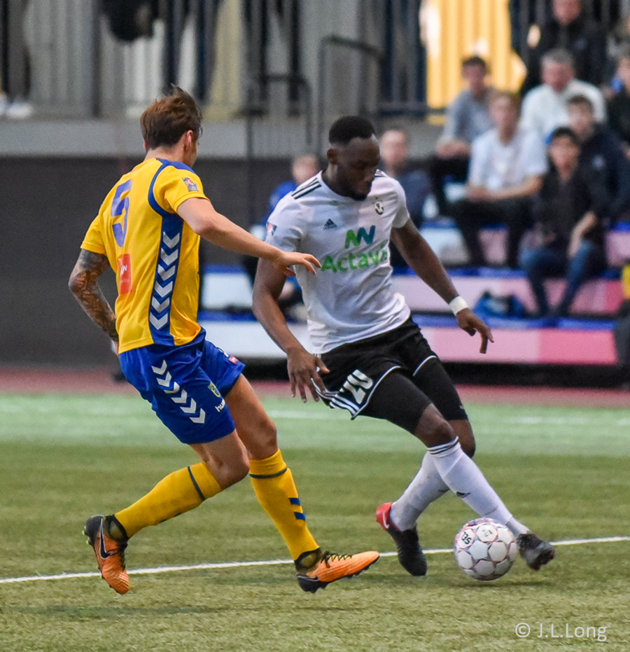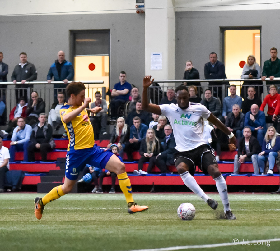 Birnir Snær með geggjaðan klobba á Robbie Crawford en skot hans fer svo beint í varnarmann. Stúkan hafði mjög gaman af þessu.