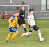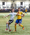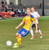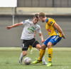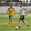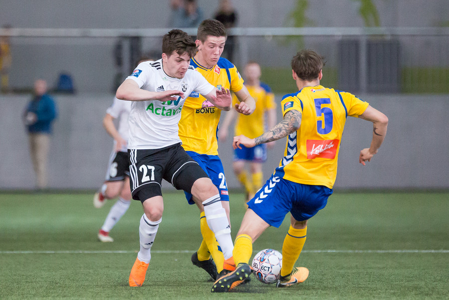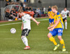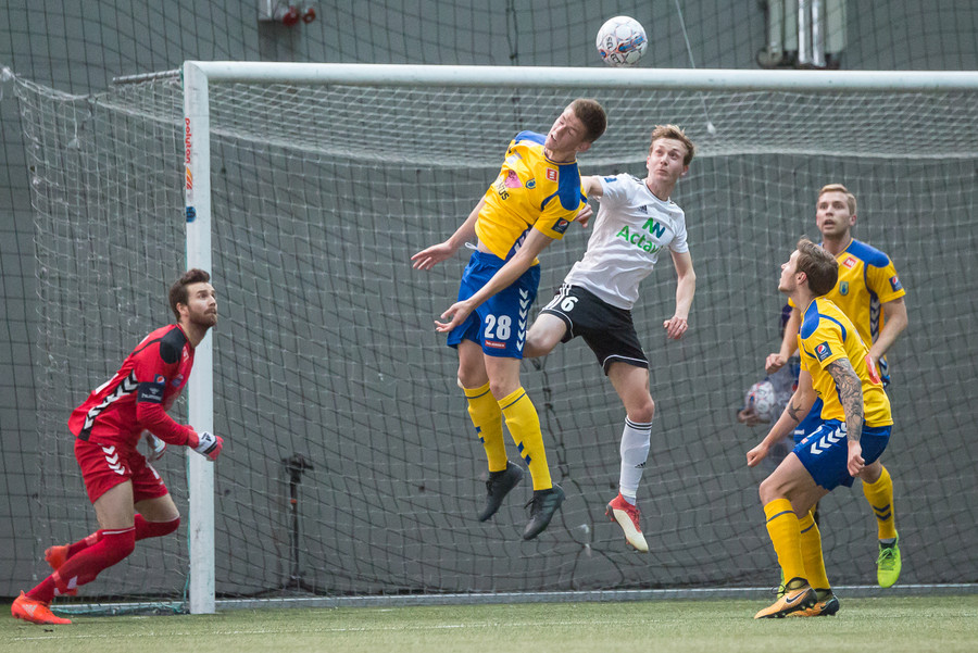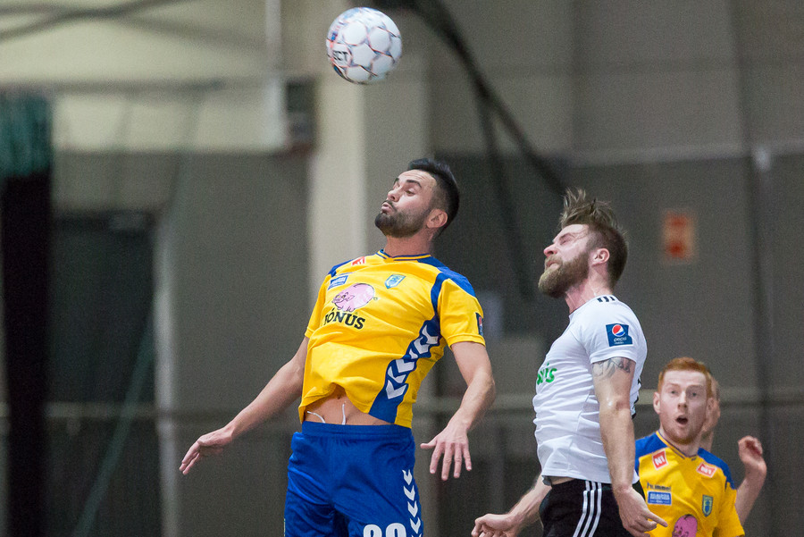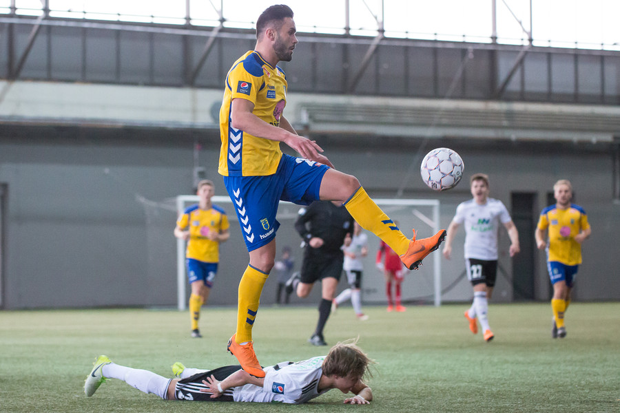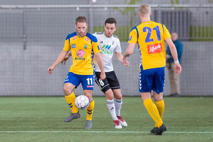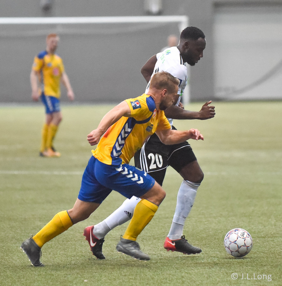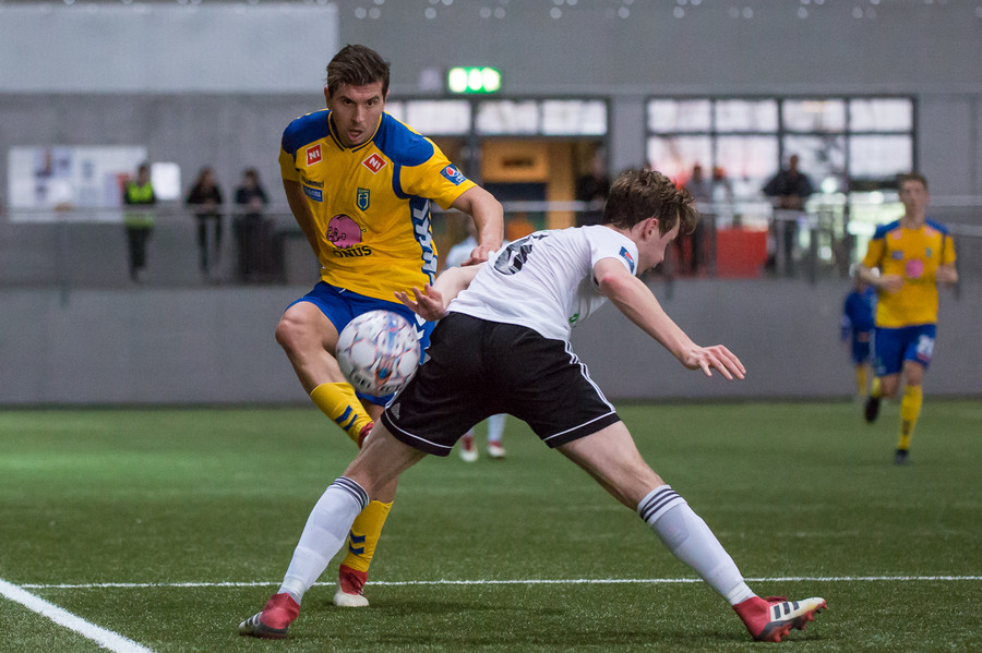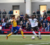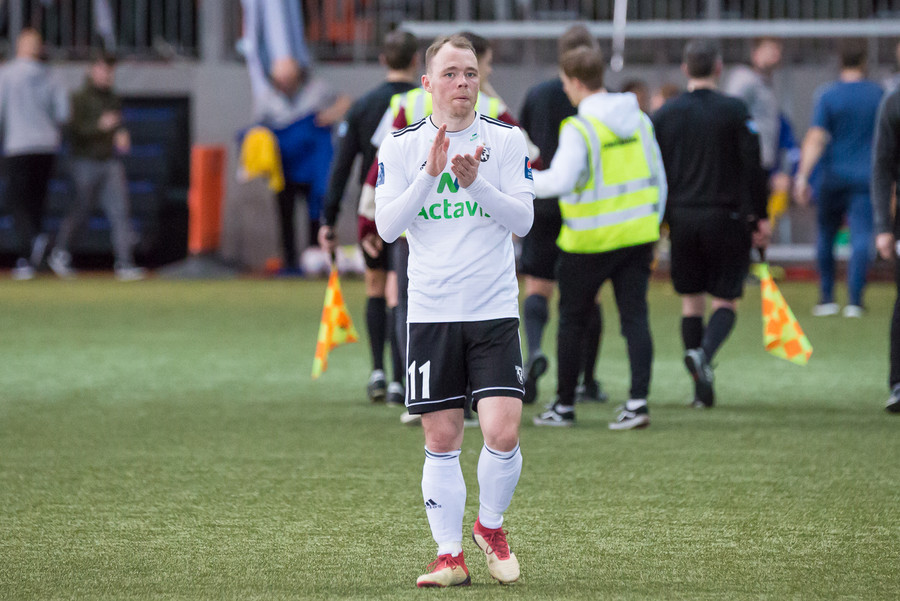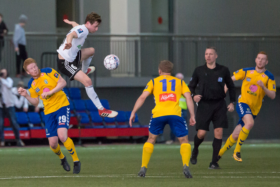Birnir Snær með geggjaðan klobba á Robbie Crawford en skot hans fer svo beint í varnarmann. Stúkan hafði mjög gaman af þessu.