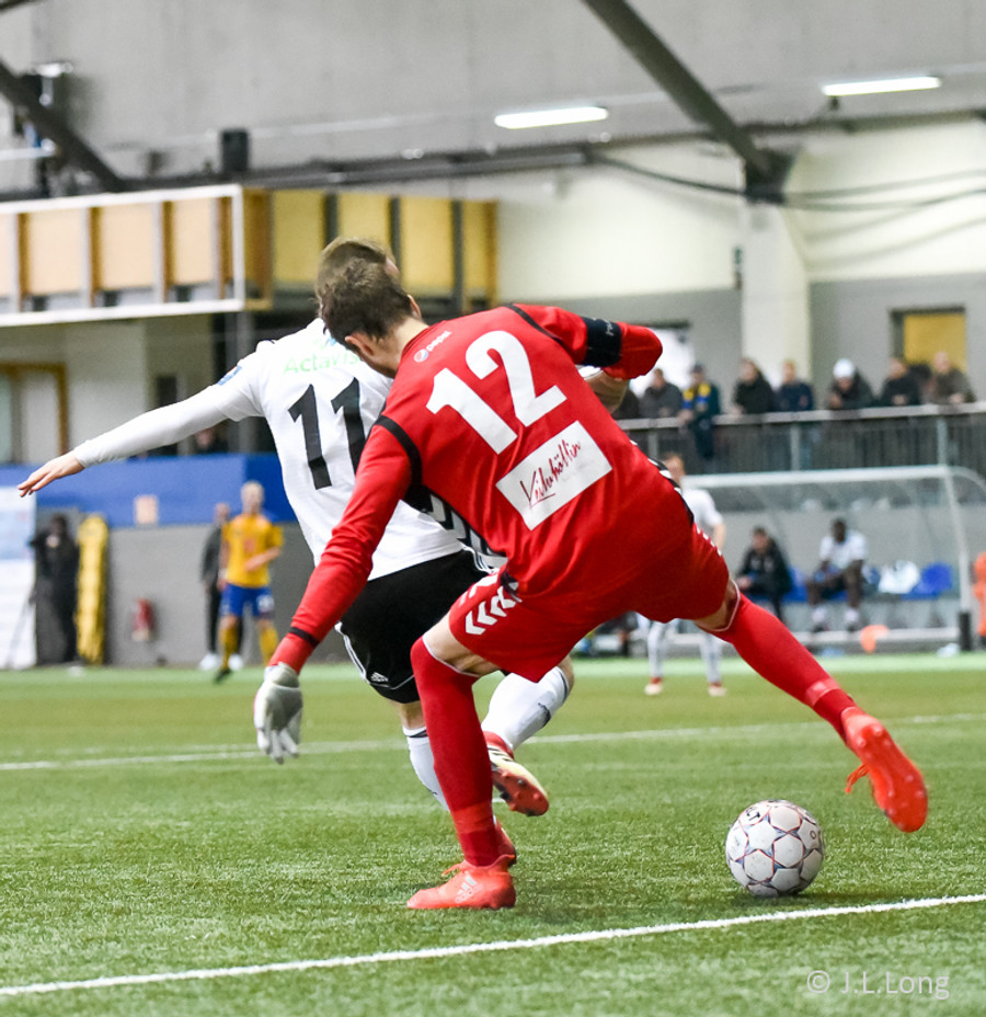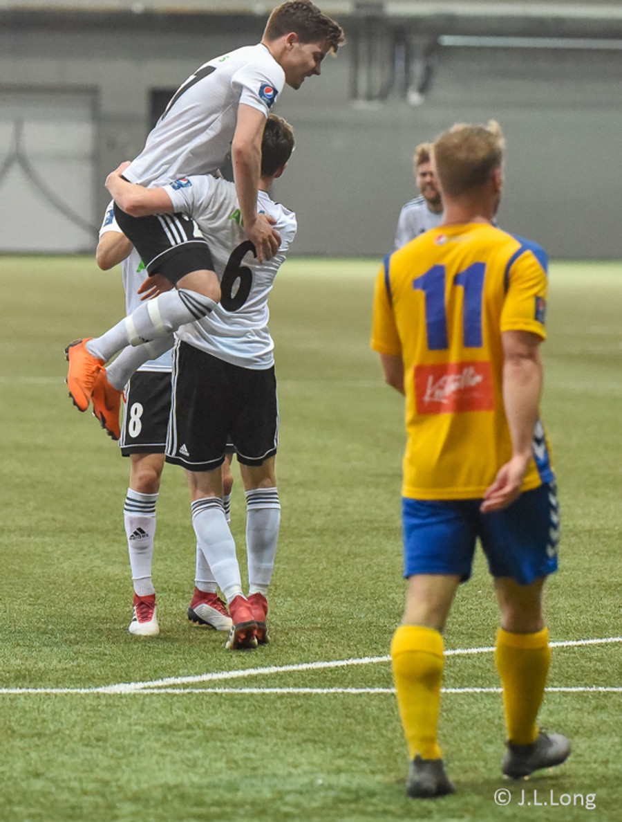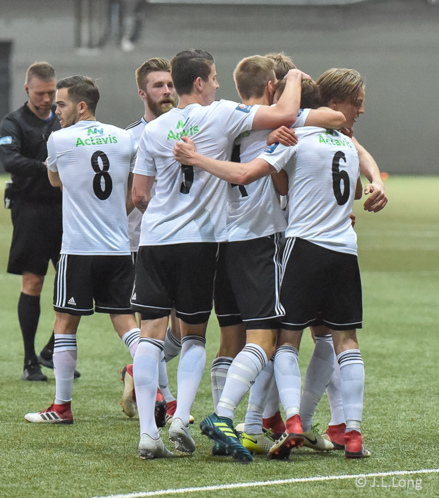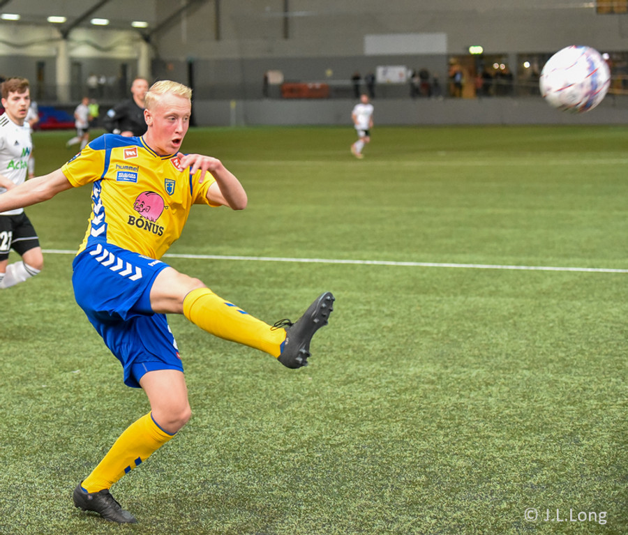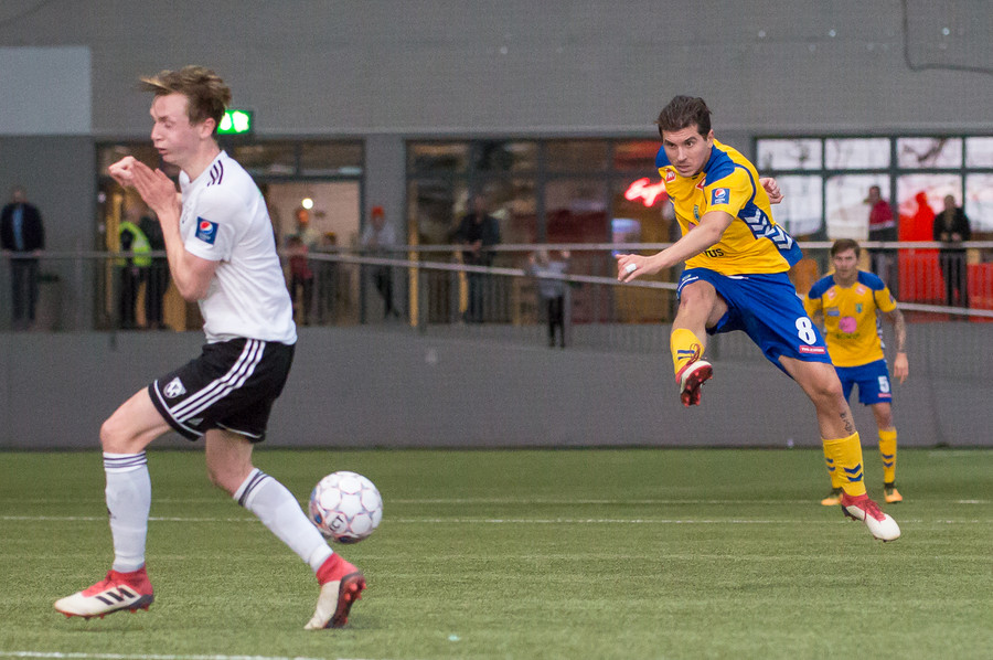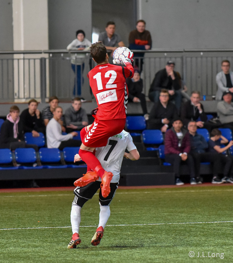 Hans Viktor reynir hér skot fyrir utan teig en boltinn fer beint í Guðmund Kristjáns og svo grípur Gunnar hann í kjölfarið. Stutt í mark hérna í Egilshöllinni. Ég finn það á mér.