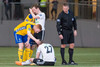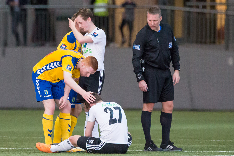 Þórður Ingason liggur hér eftir á vellinum eftir að Steven Lennon keyrir inní hann. Fjölnismenn vilja fá spjald en Pétur lætur tiltal nægja. Þórður stendur svo upp og virðist vera í lagi.