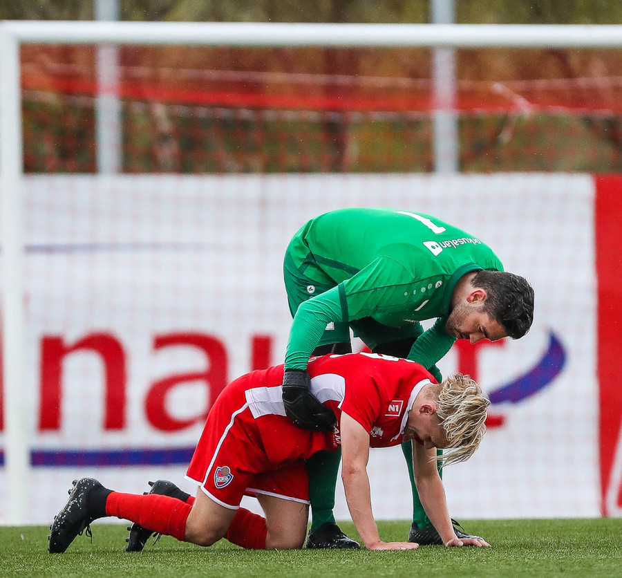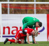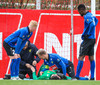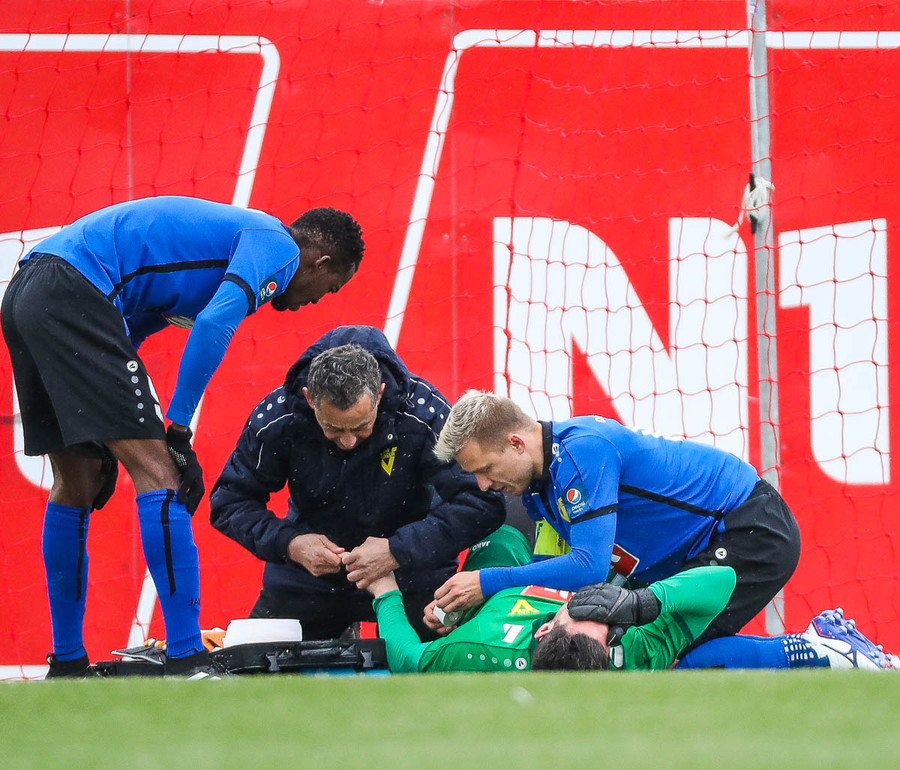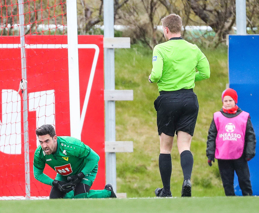 Fran Marmolejo liggur hér eftir inn í teig eftir að hafa komið út i bolta og fallið illa í samstuði. Þetta lítur ekki vel út og Víkingsr hafa engan varamarkmann á bekknum